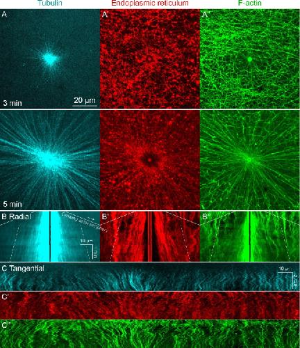 Co-movement of astral microtubules, organelles and F-actin by dynein and actomyosin forces in frog egg cytoplasm.