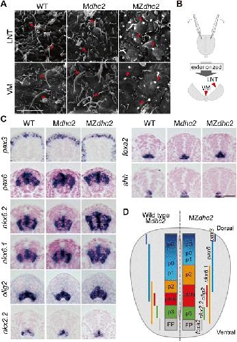 mutants. (A) SEM analysis of the ventricular surface of the neural tube at 16-somite stage. (B) Schematic view of opening of the apical surface of neural tube with forceps. (C) Expression of neural tube markers in a cross-sectional view at 16-somite stage (Dashed line in Additional file 3: Figure S3 indicates section plane). (D) Representation of the size of each progenitor domain along the DV axis. Scale bars: 5 μm in A; 20 μm in C.