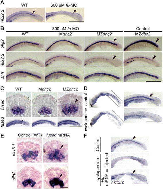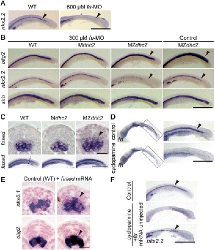fu overexpression induced ectopic nkx6.1 and olig2 expression (arrowheads). (F) The loss of nkx2.2 expression in 2.5 μM cyclopamine-treated embryos was rescued by overexpression of fused. Scale bars: 500 μm in A, B, C (lower panel), D, F; 20 μm in C (upper panel), E.