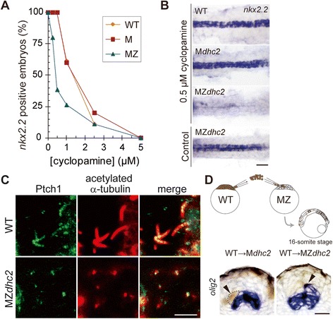 mutants but Ptch1 is localized to the cilia. (A) The percentage of nkx2.2-positive embryos with the graded series of cyclopamine treatment (Sample numbers are indicated in Additional file 6: Table S3). (B) Dorsal view of nkx2.2 expression in 0.5 μM cyclopamine treated and control (DMSO-treated) embryos. (C) Localization of Ptch1 on cilia stained with the anti-acetylated α-tubulin antibody in the neuroepithelium at 16-somite stage. (D) Transplantation of biotin-injected WT cells into MZdhc2 cells, with its schematic view, resulted in ectopic olig2 expression of WT cells in the dorsal region of MZdhc2 neural tube (arrowhead). Scale bars: 100 μm in B, 5 μm in C; 20 μm in D.