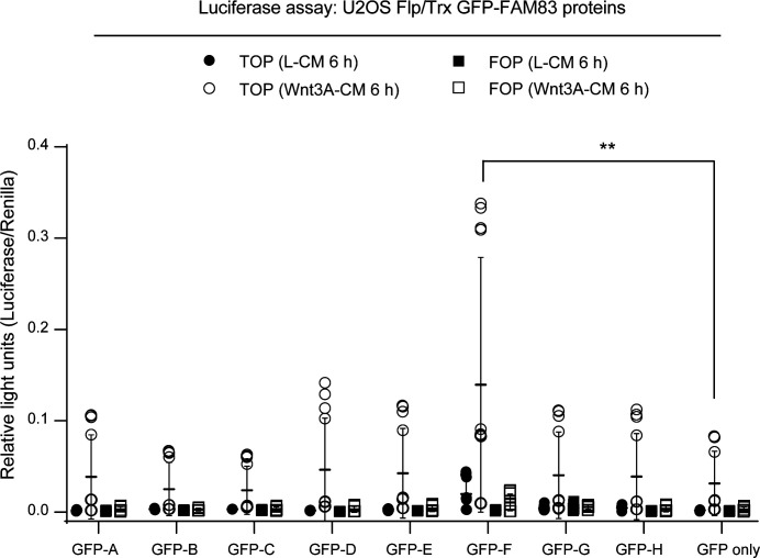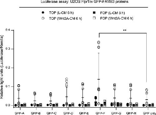 Figure S1. Canonical Wnt signalling activation following ectopic expression of GFP-FAM83 proteins.Relative luciferase activity in U2OS Flp/Trx cells expressing GFP-FAM83A, GFP-FAM83B, GFP-FAM83C, GFP-FAM83D, GFP-FAM83E, GFP-FAM83F, GFP-FAM83G, GFP-FAM83H, and GFP only treated with either L-CM or Wnt3A-CM for 24 h. TOPflash and FOPflash luciferase activity presented as relative light units normalised to Renilla expression, the transfection control plasmid. Data presented as scatter graph illustrating individual data points with an overlay of the mean ± SD. Expression of GFP-FAM83A, GFP-FAM83B, GFP-FAM83C, GFP-FAM83D, GFP-FAM83E, GFP-FAM83F, GFP-FAM83G, GFP-FAM83H, and GFP only in U2OS Flp/Trx cells was induced by a treatment with 20 ng/ml doxycycline for 24 h. Statistical significance was determined using a Studentâs unpaired t test and comparing cell lines as denoted on graph. Statistically significant P-values are denoted by asterisks (**** < 0.0001, *** < 0.001, ** < 0.01, * < 0.05). |