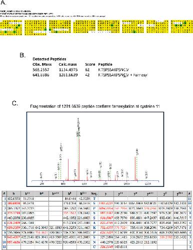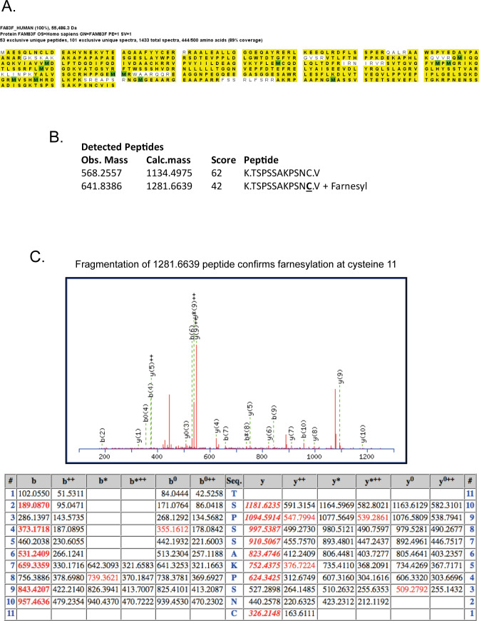 Figure S3. FAM83F is identified as farnesylated by mass spectrometry.(A) HEK-293 Flp/Trx cells expressing GFP-FAM83F were lysed and subjected to immunoprecipitation with GFP trap beads. GFP eluted proteins were resolved by SDS–PAGE, protein bands were excised and trpysin-digested for mass spectrometry analysis. Mass spectrometry peptide coverage of the FAM83F protein sequence as demonstrated by highlighted residues. (B) Two detected peptides which correspond to the C′-terminal residues of FAM83F protein with both non-farnesylated peptides and farnesylated peptides identified by mass spectrometry. (C) Fragmentation of the farnesylated peptide to confirm presence of a farnesyl group on the cysteine residue which corresponds to the CAAX box cysteine. |
