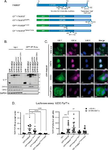 Figure 2. FAM83F-casein kinase 1α (CK1α) interaction is required for membrane localisation and canonical Wnt signalling effects.(A) Cartoon of FAM83F protein illustrating the location of the CK1 binding and farnesylation motifs. Cartoons of the GFP-tagged FAM83F point mutants expressed in (B, C, D) are also indicated. (B) Lysates from U2OS Flp/Trx cells expressing GFP, GFP-FAM83A, GFP-FAM83F, GFP-FAM83FC497A, GFP-FAM83FD250A, or GFP-FAM83FF284A/F288A were subjected to immunoprecipitation with GFP trap beads. Input lysates and GFP IPs were resolved by SDSâPAGE and subjected to Western blotting with the indicated antibodies. (C) Representative wide-field immunofluorescence microscopy images of U2OS Flp/Trx cells expressing GFP-FAM83F, GFP-FAM83FC497A, GFP-FAM83FD250A, or GFP-FAM83FF284A/F288A, labelled with antibodies recognising GFP (far left panels, green), CK1α (second row of panels from left, magenta), and DAPI (third row of panels from left, blue). Overlay of GFP, CK1α, and DAPI images as a merge is shown on the right. Immunofluorescence images captured with a 60à objective. Scale bar represents 10 μm. (D) Relative luciferase activity in U2OS Flp/Trx cells expressing GFP, GFP-FAM83F, GFP-FAM83FC497A, GFP-FAM83FD250A, or GFP-FAM83FF284A/F288A treated with either L- or Wnt3A-conditioned medium for 6 h. Luciferase activity is presented as TOPflash luciferase normalised to FOPflash luciferase and Renilla expression, the transfection control plasmid. Data presented as scatter graph illustrating individual data points with an overlay of the mean ± SD. Expression of GFP, GFP-FAM83A, GFP-FAM83F, GFP-FAM83FC497A, GFP-FAM83FD250A, and GFP-FAM83FF284A/F288A in U2OS Flp/Trx cells was induced by a treatment with 20 ng/ml doxycycline for 24 h. Statistical analysis of (C) was completed using a Studentâs unpaired t test and comparing cell lines as denoted on graph. Statistically significant P-values are denoted by asterisks (**** < 0.0001, *** < 0.001, ** < 0.01, * < 0.05).Source data are available for this figure. |