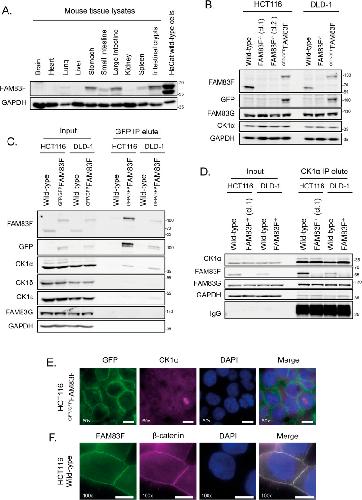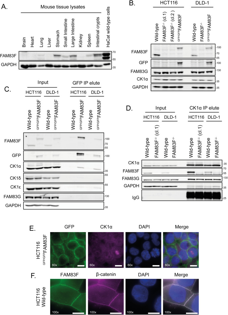 Figure 3. Endogenous FAM83F localises to the plasma membrane and interacts with casein kinase 1α (CK1α).(A) Extractions from mouse tissues: brain, heart, lung, liver, stomach, small intestine, large intestine, kidney, spleen, and intestinal crypts, plus HaCaT wild-type cells were resolved by SDSâPAGE and subjected to Western blotting with indicated antibodies. (B) HCT116 wild-type, HCT116 FAM83Fâ/â (cl.1), HCT116 FAM83Fâ/â (cl.2), HCT116 GFP/GFPFAM83F, DLD-1 wild-type, DLD-1 FAM83Fâ/â, and DLD1 GFP/GFPFAM83F cell extracts were resolved by SDSâPAGE and subjected to Western blotting with indicated antibodies. (C) HCT116 wild-type, HCT116 GFP/GFPFAM83F, DLD-1 wild-type, and DLD-1 GFP/GFPFAM83F cell extracts were subjected to immunoprecipitation with GFP trap beads. Input lysates and GFP IPs were resolved by SDSâPAGE and subjected to Western blotting with indicated antibodies. (D) HCT116 wild-type, HCT116 FAM83Fâ/â (cl.1), DLD-1 wild-type, and DLD-1 FAM83Fâ/â cell extracts were subjected to immunoprecipitation with anti-CK1α antibody. Input lysates and CK1α IPs were resolved by SDSâPAGE and subjected to Western blotting with indicated antibodies. (E) Representative wide-field immunofluorescence microscopy images of HCT116 GFP/GFPFAM83F cells, labelled with antibodies recognising GFP (far left panels, green), CK1α (second row of panels from left, magenta), and DAPI (third row of panels from left, blue). Overlay of GFP, CK1α, and DAPI images as a merge is shown on the right. Immunofluorescence images captured with a 60à objective. (F) Representative wide-field immunofluorescence microscopy images of HCT116 wild-type cells, labelled with antibodies recognising FAM83F (far left panels, green), β-catenin (second row of panels from left, magenta), and DAPI (third row of panels from left, blue). Overlay of FAM83F, β-catenin, and DAPI images as a merge is shown on the right. Immunofluorescence images captured with a 100à objective. Scale bar represents 10 μm.Source data are available for this figure. |