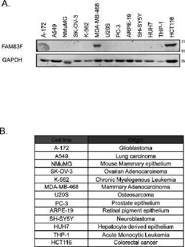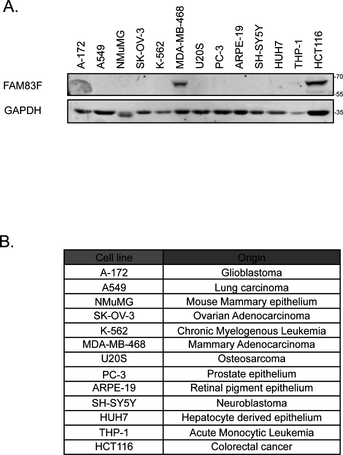 Figure S6. FAM83F expression in various cell lines.(A) Cell lysates from A-172, A549, NMuMG, SK-OV-3, K-562, MDA-MB-468, U2OS, PC-3, ARPE-19, SH-SY5Y, HUH7, THP-1, and HCT116 cells were resolved by SDS–PAGE and subjected to Western blotting with indicated antibodies. (A, B) Table indicating the cell of origin for all the cell lines used in (A).Source data are available for this figure. |