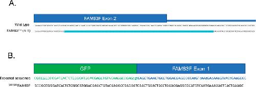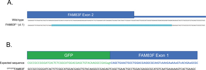 Figure S7. Sequencing of CRISPR/Cas9 cell lines.(A) DNA sequence of FAM83F exon 2 for HCT116 wild-type and HCT116 FAM83F−/− (cl.1) cell lines indicating large deletion in FAM83F exon 2 in HCT116 FAM83F−/− (cl.1) cell lines. (B) Expected DNA sequence and actual DNA sequence of HCT116 GFP/GFPFAM83F cell lines of the transition zone between GFP and FAM83F exon 1. |