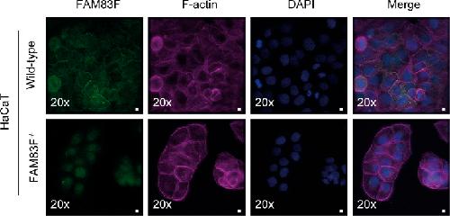 Figure S8. Negative controls for anti-FAM83F antibody immunofluorescence.Representative wide-field immunofluorescence microscopy images of HaCaT wild-type cells and HaCaT FAM83Fâ/â cells, labelled with antibodies recognising FAM83F (far left panels, green), F-actin (second row of panels from left, magenta) and DAPI (third row of panels from left, blue). Overlay of FAM83F, F-actin, and DAPI images as a merge is shown on the right. Immunofluorescence images captured with a 20à objective. Scale bar represents 10 μm. |