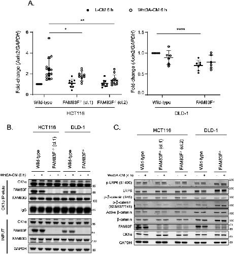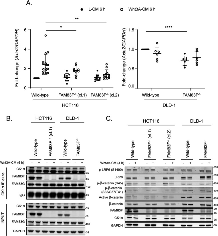 Figure 4. Knockout of FAM83F reduces canonical Wnt signalling in colorectal cancer cells.(A) qRT-PCR was performed using cDNA from HCT116 wild-type, HCT116 FAM83Fâ/â (cl.1), HCT116 FAM83Fâ/â (cl.2), DLD-1 wild-type and DLD-1 FAM83Fâ/â cells following treatment with L-CM or Wnt3A-CM for 6 h, and primers for Axin2 and GAPDH genes. Axin2 mRNA expression was normalised to GAPDH mRNA expression and represented as fold change compared to L-CM treated wild-type cells. Data presented as scatter graph illustrating individual data points with an overlay of the mean ± SD. (B) HCT116 wild-type, HCT116 FAM83Fâ/â (cl.1), DLD-1 wild-type, and DLD-1 FAM83Fâ/â cells treated with L-CM or Wnt3A-CM for 6 h, were subjected to immunoprecipitation with casein kinase 1α (CK1α) antibody. Input lysates and CK1α IPs were resolved by SDSâPAGE and subjected to Western blotting with indicated antibodies. (C) Lysates from HCT116 wild-type, HCT116 FAM83Fâ/â (cl.1), HCT116 FAM83Fâ/â (cl.2), DLD-1 wild-type, and DLD-1 FAM83Fâ/â cells following treatment with L-CM or Wnt3A-CM for 4 h, were resolved by SDSâPAGE and subjected to Western blotting with indicated antibodies. Statistical analysis of (A) was completed using a Studentâs unpaired t test and comparing cell lines as denoted on graph. Statistically significant P-values are denoted by asterisks (**** < 0.0001, *** < 0.001, ** < 0.01, * < 0.05).Source data are available for this figure. |