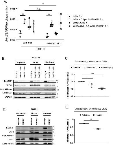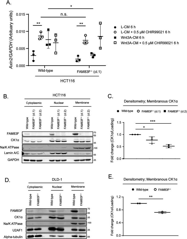 Figure 5. FAM83F acts upstream of glycogen synthase kinase-3β and the loss of FAM83F protein reduces casein kinase 1α (CK1α) protein abundance at the plasma membrane.(A) qRT-PCR was performed using cDNA from HCT116 wild-type and HCT116 FAM83Fâ/â (cl.1) cell lines following treatment with L-CM or Wnt3A-CM with or without 0.5 μM CHIR99021 for 6 h, and primers for Axin2 and GAPDH genes. Axin2 mRNA expression was normalised to GAPDH mRNA expression and represented as arbitrary units. Data presented as scatter graph illustrating individual data points with an overlay of the mean ± SD. (B) Cytoplasmic, nuclear, and membrane lysates from HCT116 wild-type, HCT116 FAM83Fâ/â (cl.1), and HCT116 FAM83Fâ/â (cl.2) cell lines were resolved by SDSâPAGE and subjected to Western blotting with indicated antibodies. (C) Densitometry of CK1α protein abundance from (B) membrane lysates normalised to GAPDH protein abundance and represented as fold change compared with HCT116 wild-type cells. Data presented as scatter graph illustrating individual data points with an overlay of the mean ± SD. (D) Cytoplasmic, nuclear, and membrane lysates from DLD-1 wild-type and DLD-1 FAM83Fâ/â cell lines were resolved by SDSâPAGE and subjected to Western blotting with indicated antibodies. (E) Densitometry of CK1α protein abundance from (D) membrane lysates normalised to Na/K ATPase protein abundance and represented as fold change compared with DLD-1 wild-type cells. Data presented as scatter graph illustrating individual data points with an overlay of the mean ± SD. (B, D) The specificity of cytoplasmic, nuclear and membrane compartment lysates were determined by Western blotting with the following subcellular compartment-specific antibodies: α-tubulin (cytoplasmic), Lamin A/C (nuclear), U2AF1 (nuclear), and Na/K ATPase (membrane). (A, C, E) Statistical analysis was completed using a Studentâs unpaired t test and comparing cell lines as denoted on graphs. Statistically significant P-values are denoted by asterisks (**** < 0.0001, *** < 0.001, ** < 0.01, * < 0.05).Source data are available for this figure. |