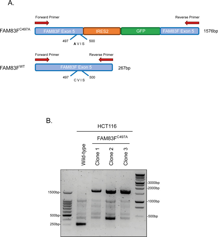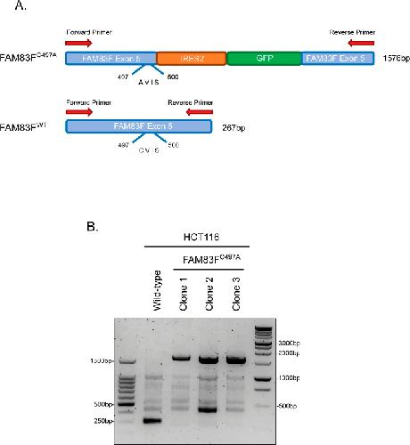 Figure S10. Confirmation of FAM83FC497A-IRES2-GFP knock-in donor into the FAM83F locus in HCT116 FAM83FC497A cell lines.(A) Cartoon of the expected PCR product in FAM83FC497A knock-in cells in which the FAM83FC497A-IRES2-GFP donor sequence has been incorporated by CRISPR/Cas9 genome editing into the FAM83F locus or FAM83FWT cell lines with no alteration in the FAM83F sequence. The expected PCR product size is noted on the right side of cartoon. (B) PCR was performed using genomic DNA from HCT116 wild-type and HCT116 FAM83FC497A (clones 1â3) cell lines, and sequencing primers for the Câ² terminus of FAM83F with PCR products visualised on an 1.5% agarose gel. Sequencing confirms clones 1 and 3 are homozygous for FAM83FC497A knock-in and clone 2 is heterozygous with one allele incorporating the FAM83FC497A knock-in donor and the other allele incorporating a random 119-bp insertion at the FAM83F Câ²-terminal gRNA target site for Cas9 cleavage. |