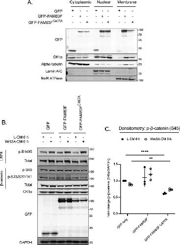 Figure S11. U2OS Flp/Trx GFP-FAM83FC497A protein expression reduces cytoplasmic casein kinase 1α (CK1α) and phosphorylated β-catenin (Serine 45) protein levels.(A) Cytoplasmic, nuclear, and membrane lysates from U2OS Flp/Trx (GFP only, GFP-FAM83F, and GFP-FAM83FC497A) cells were resolved by SDSâPAGE and subjected to Western blotting with the indicated antibodies. The specificity of cytoplasmic, nuclear and membrane compartment lysates were determined by Western blotting with the following subcellular compartment-specific antibodies: α-tubulin (cytoplasmic), Lamin A/C (nuclear), Na/K ATPase (membrane). (B) Lysates from U2OS Flp/Trx (GFP only, GFP-FAM83F and GFP-FAM83FC497A) cells following treatment with L-CM or Wnt3A-CM for 6 h were resolved by SDSâPAGE and subjected to Western blotting with the indicated antibodies. (C) Densitometry of p-β-catenin (S45) protein abundance from (B) normalised to GAPDH protein abundance and represented as fold change compared to U2OS Flp/Trx cells expressing GFP only. Data presented as scatter graph illustrating individual data points with an overlay of the mean ± SD. Statistical significance was determined using a Studentâs unpaired t test and comparing cell lines as denoted on graphs. Statistically significant P-values are denoted by asterisks (**** < 0.0001, *** < 0.001, ** < 0.01, * < 0.05). Expression of GFP, GFP-FAM83F, and GFP-FAM83FC497A in U2OS Flp/Trx cells was induced by a treatment with 20 ng/ml doxycycline for 24 h.Source data are available for this figure. |