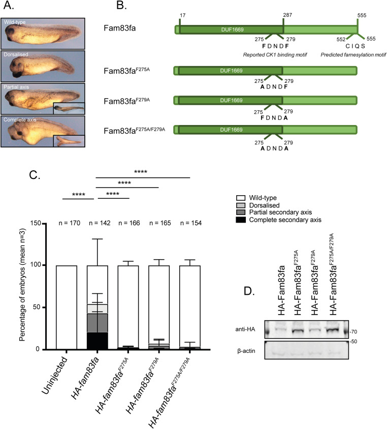 Figure 1. Fam83f induces axis duplication in Xenopus embryos through an interaction with casein kinase 1α (CK1α).(A) Bright-field microscopy images of Xenopus embryo axis duplication phenotypes; wild-type, dorsalised, partial secondary axis and complete secondary axis. (B) Cartoon of Fam83fa protein illustrating the location of the CK1 binding and farnesylation motifs and cartoons of the point mutants expressed in (C, D). (C) Percentage of Xenopus embryos showing phenotypes depicted in (A) following injection with HA-tagged zebrafish fam83fa, fam83faF275A, fam83faF279A, or fam83faF275A/F279A mRNA. Data represent three independent experiments with total numbers of Xenopus embryos denoted above the graph. Bar graph representing mean + SD. Statistical significance determined by two-way ANOVA with Tukeyâs post hoc test to compare the percentage of embryos displaying a wild-type phenotype. ****P ⤠0.0001. (D) Protein extracts from Xenopus embryos following injection with HA tagged zebrafish fam83fa, fam83faF275A, fam83faF279A, or fam83faF275A/F279A mRNA were resolved by SDSâPAGE and subjected to Western blotting with indicated antibodies.Source data are available for this figure. |
