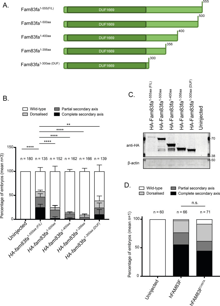 Figure S2. Zebrafish Fam83fa DUF1669 domain and FAM83F farnesylation mutants can still induce axis duplication.(A) Cartoon of Fam83fa protein truncations expressed in (B, C). (B) Percentage of Xenopus embryos showing phenotypes as depicted in Fig 1A following injection with HA tagged fam83fa1-555aa(F/L), fam83fa1-500aa, fam83fa1-400aa, fam83fa1-356aa, or fam83fa1-300aa (DUF) mRNA. Data represent three independent experiments with total numbers of embryos observed denoted above the graph. Bar graph represents mean + SD. Statistical significance was determined by two-way ANOVA with Dunnett’s post hoc test to compare the percentage of embryos displaying a wild-type phenotype. ****P ≤ 0.0001, **P ≤ 0.01. (C) Protein extracts from Xenopus embryos following injection with HA tagged zebrafish fam83fa1-555aa(F/L), fam83fa1-500aa, fam83fa1-400aa, fam83fa1-356aa, or fam83fa1-300aa (DUF) mRNA were resolved by SDS–PAGE and subjected to Western blotting with indicated antibodies. (D) Percentage of Xenopus embryos showing phenotypes as depicted in Fig 1A following injection with human FAM83F or FAM83FC497A mRNA. Data represent one independent experiment with total numbers of embryos denoted above the graph. n.s., not significant; Chi squared test. F/L, full-length; DUF, Domain of unknown function 1669.Source data are available for this figure. |