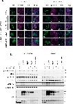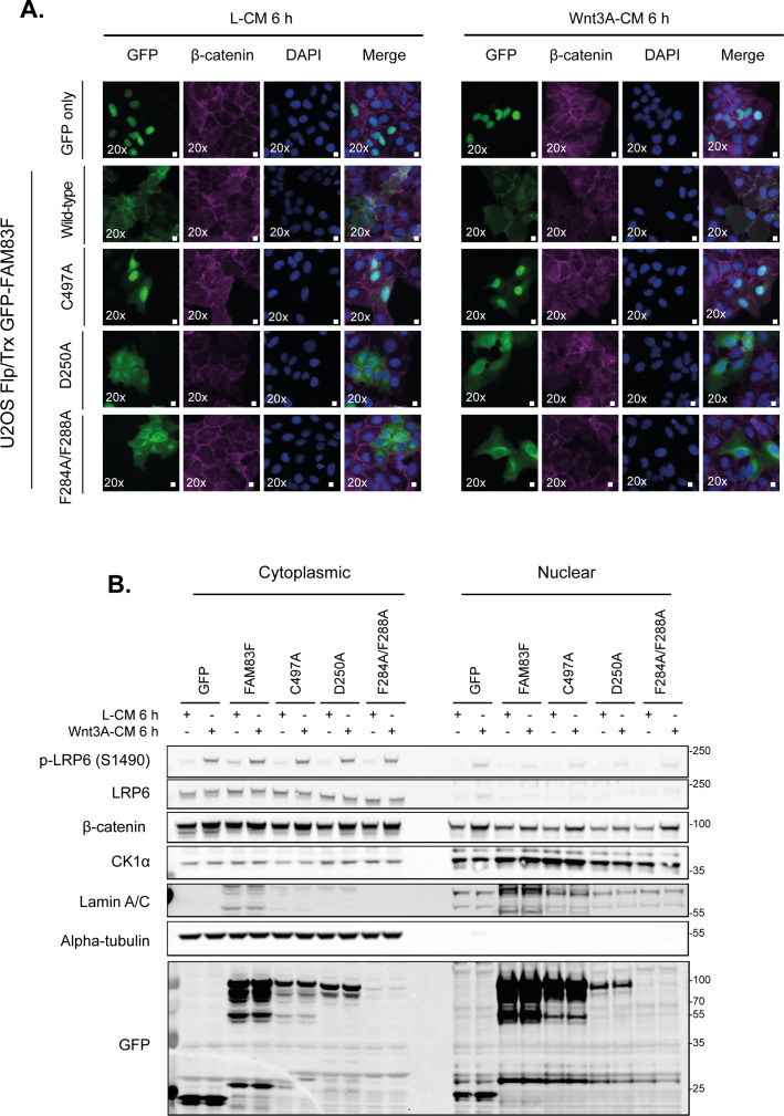 Figure S4. Effect of overexpression of GFP-FAM83F proteins on nuclear translocation of β-catenin.(A) Representative widefield immunofluorescence microscopy images of U2OS Flp/Trx cells expressing GFP only, GFP-FAM83F, GFP-FAM83FC497A, GFP-FAM83FD250A, or GFP-FAM83FF284A/F288A, labelled with antibodies recognising GFP (far left panels, green), β-catenin (second row of panels from left, magenta) and DAPI (third row of panels from left, blue). Overlay of GFP, β-catenin, and DAPI images as a merge is shown on the right. Cells were treated with either L- or Wnt3Aâconditioned media for 6 h. Immunofluorescence images captured with a 20à objective. Scale bar represents 10 μm. (B) Cytoplasmic and nuclear extracts from U2OS Flp/Trx cells expressing GFP only, GFP-FAM83F, GFP-FAM83FC497A, GFP-FAM83FD250A, or GFP-FAM83FF284A/F288A following treatment with either L- or Wnt3Aâconditioned media for 6 h, were resolved by SDSâPAGE and subjected to Western blotting with indicated antibodies. The specificity of cytoplasmic and nuclear lysates was determined by Western blotting with the following subcellular compartment-specific antibodies: α-tubulin (cytoplasmic) and Lamin A/C (nuclear). Expression of GFP tagged proteins in U2OS Flp/Trx cells was induced by a treatment with 20 ng/ml doxycycline for 24 h.Source data are available for this figure. |