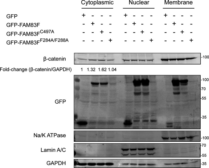 Figure S5. Overexpression of GFP-FAM83F and GFP-FAM83FC497A protein increases cytoplasmic β-catenin levels.Cytoplasmic, nuclear and membrane lysates from U2OS Flp/Trx cells expressing GFP only, GFP-FAM83F, GFP-FAM83FC497A or GFP-FAM83FF284A/F288A were resolved by SDS–PAGE and subjected to Western blotting with indicated antibodies. The specificity of subcellular fractions was determined by Western blotting with the following subcellular compartment-specific antibodies: GAPDH (cytoplasmic), Lamin A/C (nuclear) and Na/K ATPase (membrane). Densitometry of cytoplasmic β-catenin and GAPDH was performed and quantification is expressed as a fold-change compared with U2OS Flp/Trx cells expressing GFP only. Expression of GFP tagged proteins in U2OS Flp/Trx cells was induced by a treatment with 20 ng/ml doxycycline for 24 h.Source data are available for this figure. |