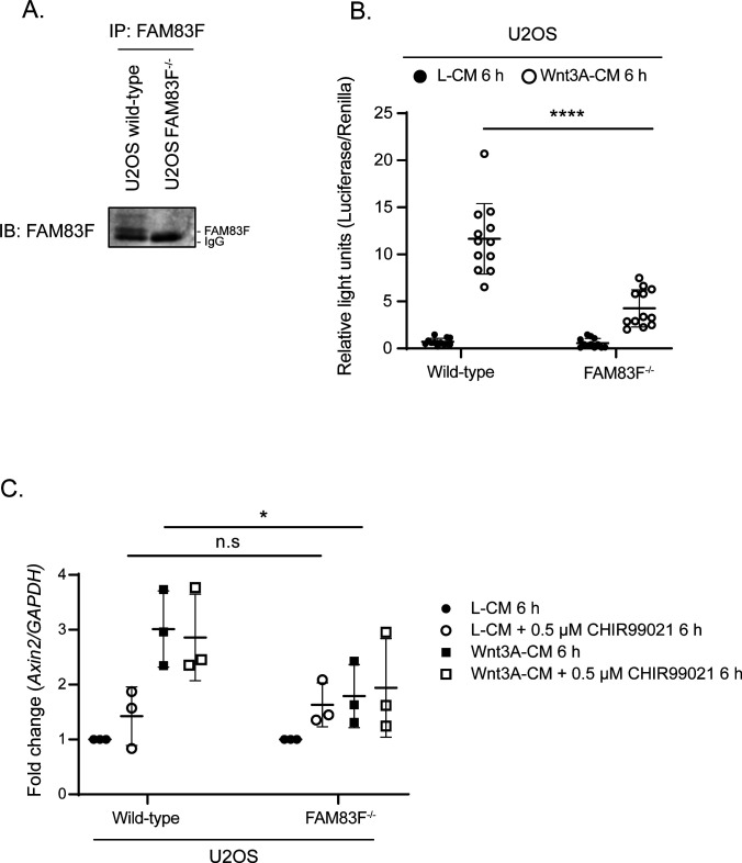 Figure S9. FAM83F knockout reduces canonical Wnt signalling in non-colorectal cancer cell lines.(A) Cell lysates from U2OS wild-type and U2OS FAM83Fâ/â cells were subjected to immunoprecipitation with anti-FAM83F antibody. FAM83F IPs were resolved by SDSâPAGE and subjected to Western blotting with FAM83F antibody. (B) Relative luciferase activity in U2OS wild-type and U2OS FAM83Fâ/â cells treated with either L-CM or Wnt3A-CM for 6 h. Luciferase activity presented as TOPflash luciferase normalised to FOPflash luciferase and Renilla expression, the transfection control plasmid. Data presented as scatter graph illustrating individual data points with an overlay of the mean ± SD. (C) qRT-PCR was performed using cDNA from U2OS wild-type and U2OS FAM83Fâ/â cell lines following treatment with L-CM or Wnt3A-CM with or without 0.5 μM CHIR99021 for 6 h, and primers for Axin2 and GAPDH genes. Axin2 mRNA expression was normalised to GAPDH mRNA expression and represented as fold change compared with L-CMâtreated cells. Data presented as scatter graph illustrating individual data points with an overlay of the mean ± SD. Statistical analysis of (B) and (C) was completed using a Studentâs unpaired t test and comparing cell lines as denoted on graphs. Statistically significant P-values are denoted by asterisks (**** < 0.0001, *** < 0.001, ** < 0.01, * < 0.05).Source data are available for this figure. |