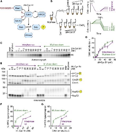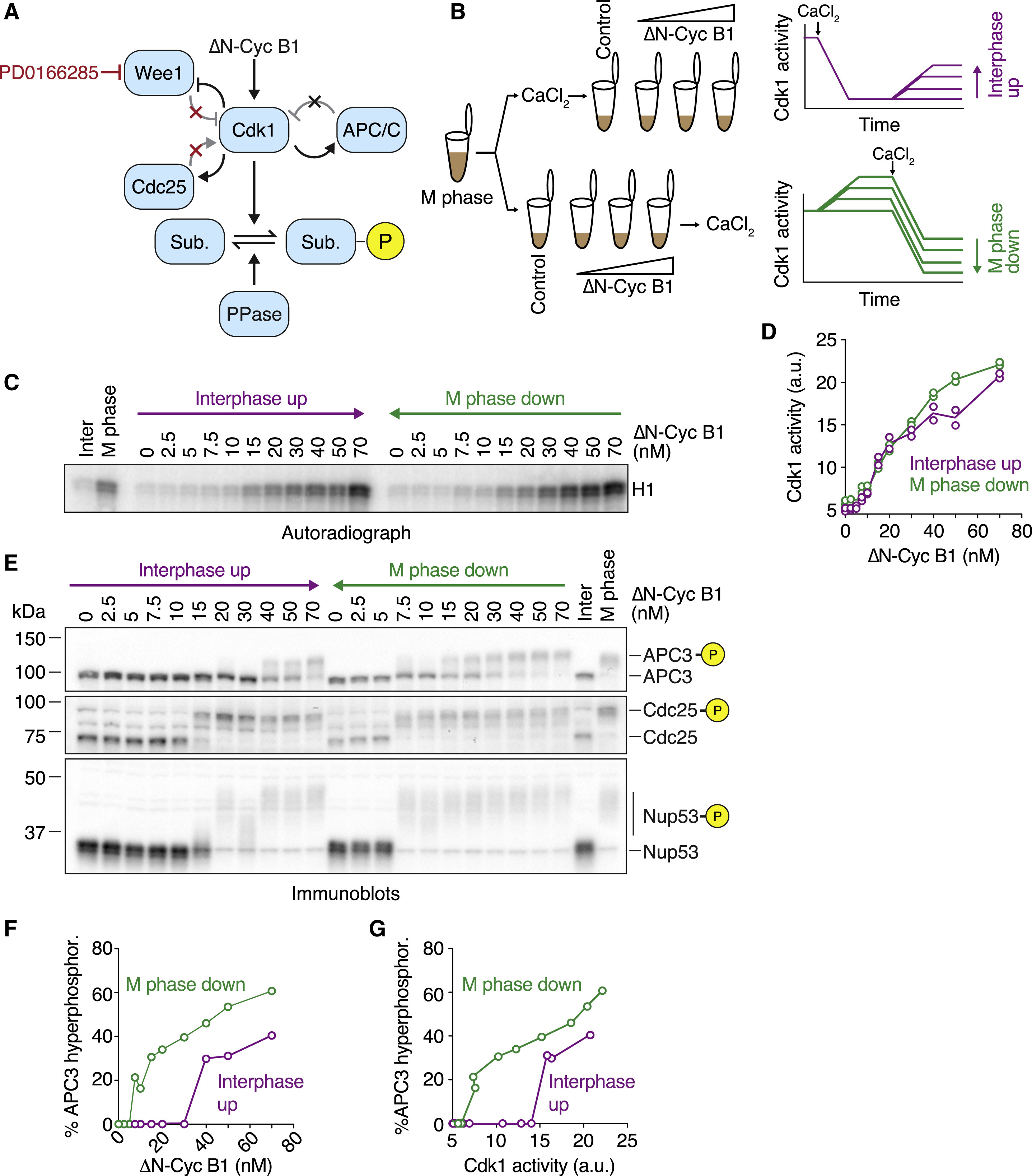 Figure 1. Cdk1 Substrate Phosphorylation Is Bistable in the Absence of Cdk1 Bistability (A) Schematic of the regulation of substrate phosphorylation by Cdk1 and opposing phosphatases. Note that the Wee1 inhibitor PD0166285 compromises the positive and double-negative feedback loops that regulate the activity of Cdk1. (B) Schematic of the hysteresis experiment. Steady-state Cdk1 activity and substrate phosphorylation were measured as a function of non-degradable cyclin B1 (δN-Cyc B1) in the presence of the Wee1/Myt1 inhibitor PD0166285. The steady state was approached either starting from a state of low (interphase up; purple) or of high (M phase down; green) cyclin B concentration/Cdk1 activity. (C and D) Cdk1 activity as a function of δN-Cyc B1 concentration (as monitored by histone H1 phosphorylation) is graded and monostable in the presence of the Wee1/Myt1 inhibitor (5 μM PD0166285). Autoradiograph of the histone phosphorylation is shown in (C). Quantification of two technical duplicates (circles) for the measurement and the mean of the duplicates (connecting lines) is shown in (D). (E) The phosphorylation state of three Cdk1 substrates (APC3, Cdc25, and Nup53), monitored by mobility shift as a function of δN-Cyc B1 concentration. Note that despite the monostable response in Cdk1 activity shown in (C) and (D), these substrates still exhibit hysteretic responses. (F and G) Quantification of the APC3 hyperphosphorylation for the experiment in (E), plotted as a function of δN-Cyc B1 concentration (F) and as a function of the corresponding Cdk1 activities (G) as measured in (D). Figure S1E shows a summary of multiple experiments for this measurement. All activity and phosphorylation state analyses (C)â(G) were performed from the same experiment. See Figure S1 for a detailed characterization of the Wee1 inhibitor (Figures S1AâS1F) and linearity tests for the antibodies (Figure S1H). |