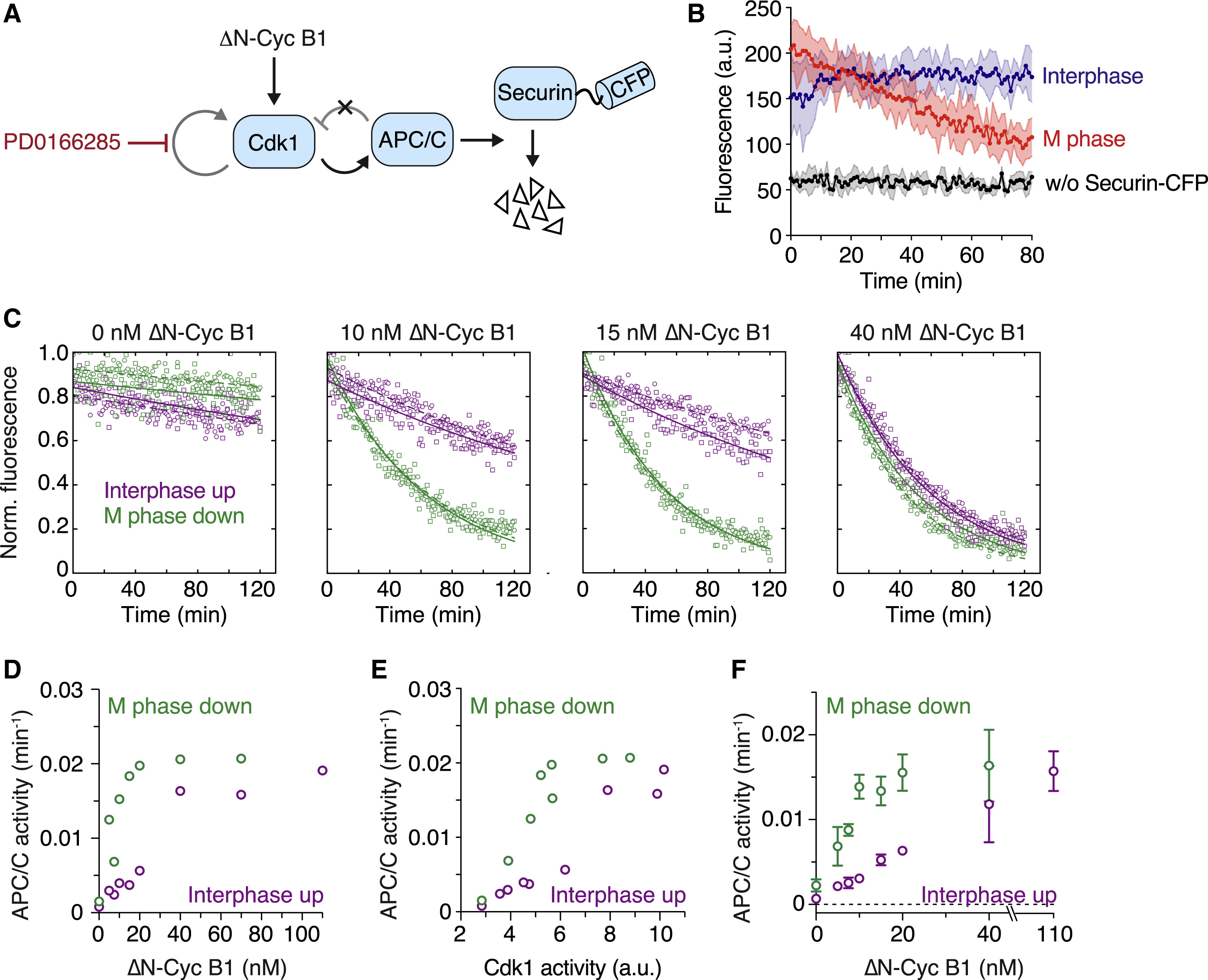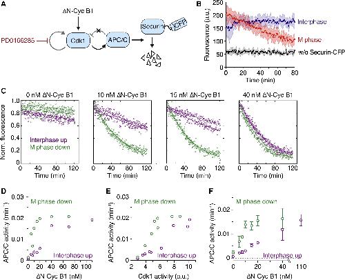 Figure 2. APC/C Activity Is Bistable in the Absence of Cdk1 Bistability (A) Schematic of the system used to assess APC/C activity. δN-Cyc B1 titration experiments were performed as described in Figure 1B and steady-state APC/C activity was measured by following the degradation of a fluorescently labeled APC/C substrate (securin-CFP) using a plate reader. (B) APC/C is activated during mitosis. Significant loss of fluorescent signal was only detected in an M phase extract (red) but not in an interphase extract (blue) or in an extract not supplemented with securin-CFP (black). Shown is the mean (circles with connecting line) and the standard deviation (error band) of a technical triplicate. (C) Securin-CFP degradation dynamics after adding different concentrations of δN-Cyc B1, approaching steady state starting from either a state of high (M phase down; green) or low (interphase up; purple) cyclin B concentration/Cdk1 activity. Shown are data from two technical replicates (circles or squares; the dashed or solid lines, respectively, show the exponential fit of the data). Note that at intermediate concentrations of δN-Cyc B1 (10 or 15 nM), the steady-state level of APC/C activity depends upon whether the system has come from interphase or M phase. (D) Quantitation of the apparent first-order rate constant for APC/C activity plotted as a function of δN-Cyc B1 for the experiment shown in (C), including additional δN-Cyc B1 concentrations. Shown is the average of a technical duplicate with standard deviation. (E) Quantitation of the apparent first-order rate constant for APC/C activity (the same activities shown in D) plotted as a function of Cdk1 activity rather than non-degradable cyclin B concentration. Shown is the average of a technical duplicate with standard deviation. (F) Quantification of the apparent first-order rate constant for APC/C activity as a function of δN-Cyc B1. Shown are mean and standard error of the mean from 4 independent experiments (for 20 nM δN-Cyc B1: n = 3; for 40 nM δN-Cyc B1: n = 2). Note that due to variability between experiments, the switch-like transition between low and high APC/C activity is less obvious in the averaged data than it is in the given single experiment (D and E). All experiments were performed in the presence of 5 μM PD0166285. |