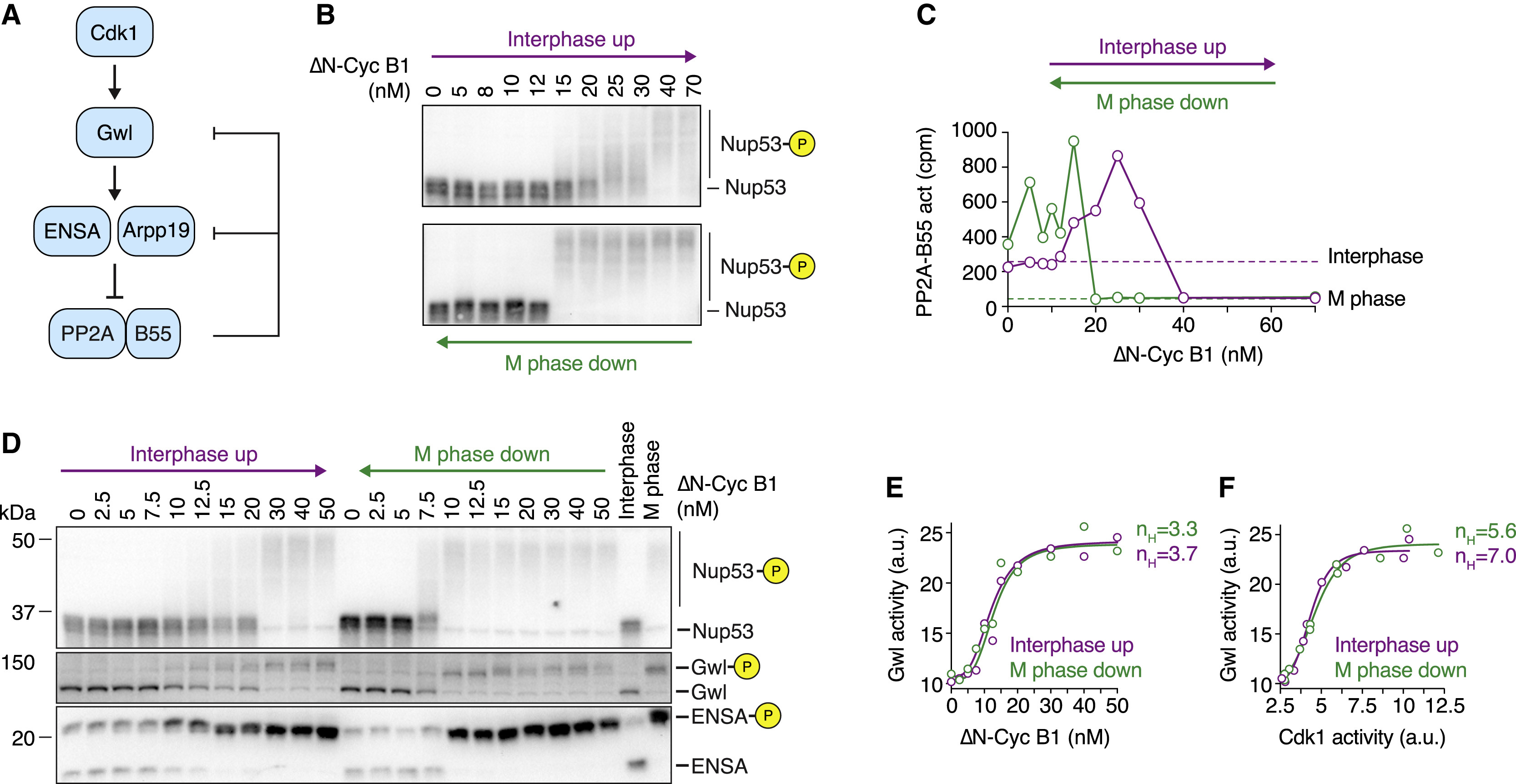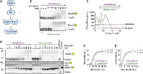 Figure 4. PP2A-B55 Activity, but Not Gwl Activity, Exhibits Bistability When Cdk1 Activity Is Graded and Monostable (A) Schematic of the regulation of PP2A-B55 activity by Cdk1 via Greatwall kinase (Gwl) and ENSA/Arpp19. Two double-negative feedback loops, a shorter one involving only PP2A-B55 and Arpp19/ENSA and a longer one involving Gwl kinase and PP2A-B55, could give rise to bistability. (B and C) The steady-state activity of PP2A-B55 is hysteretic in the presence of the Wee1/Myt1 inhibitor (10 μM PD0166285). Mitotic substrate phosphorylation (monitored by the mobility shift of Nup53) in (B) and PP2A-B55 activity in (C) are shown as a function of non-degradable cyclin B1 (ÎN-Cyc B1), approaching steady state from either a state of high (M phase down; green) or low (interphase up; purple) cyclin B concentration/Cdk1 activity (mean of technical duplicates with connecting line). Two additional experiments are shown in Figures S2BâS2E. (D) Gwl and ENSA phosphorylation exhibit bistability in the presence of the Wee1/Myt1 inhibitor (5 μM PD0166285). Phosphorylation states of several Cdk1 substrates including Gwl and ENSA were analyzed by immunoblotting. Figure S3A shows an additional experiment. 10 μM Phos-tag was used to enhance the mobility shift upon ENSA phosphorylation. A shorter exposure for the ENSA immunoblot and a quantification of the phosphorylated form of ENSA are shown in Figures S3A and S3B. An additional experiment is shown in Figures S3C and S3D and an experiment detecting ENSA phosphorylation using a phospho-specific antibody against the phosphorylated S67 epitope of ENSA is shown in Figures S3I and S3J. (E and F) Gwl kinase activity is ultrasensitive but not bistable. Cdk1 and Gwl kinase activities were measured for the experiment shown in (D) and are depicted as the dose response of Gwl kinase activity as a function of ÎN-Cyc B1 (E) or Cdk1 activity (F). Shown is the mean of a technical duplicate (circles). Although not bistable, the dose response of Gwl kinase activity exhibits significant ultrasensitivity as demonstrated by the large Hill exponent (nH) necessary to fit the data (solid lines in E and F). Additional experiments are shown in Figures S3GâS3L. |