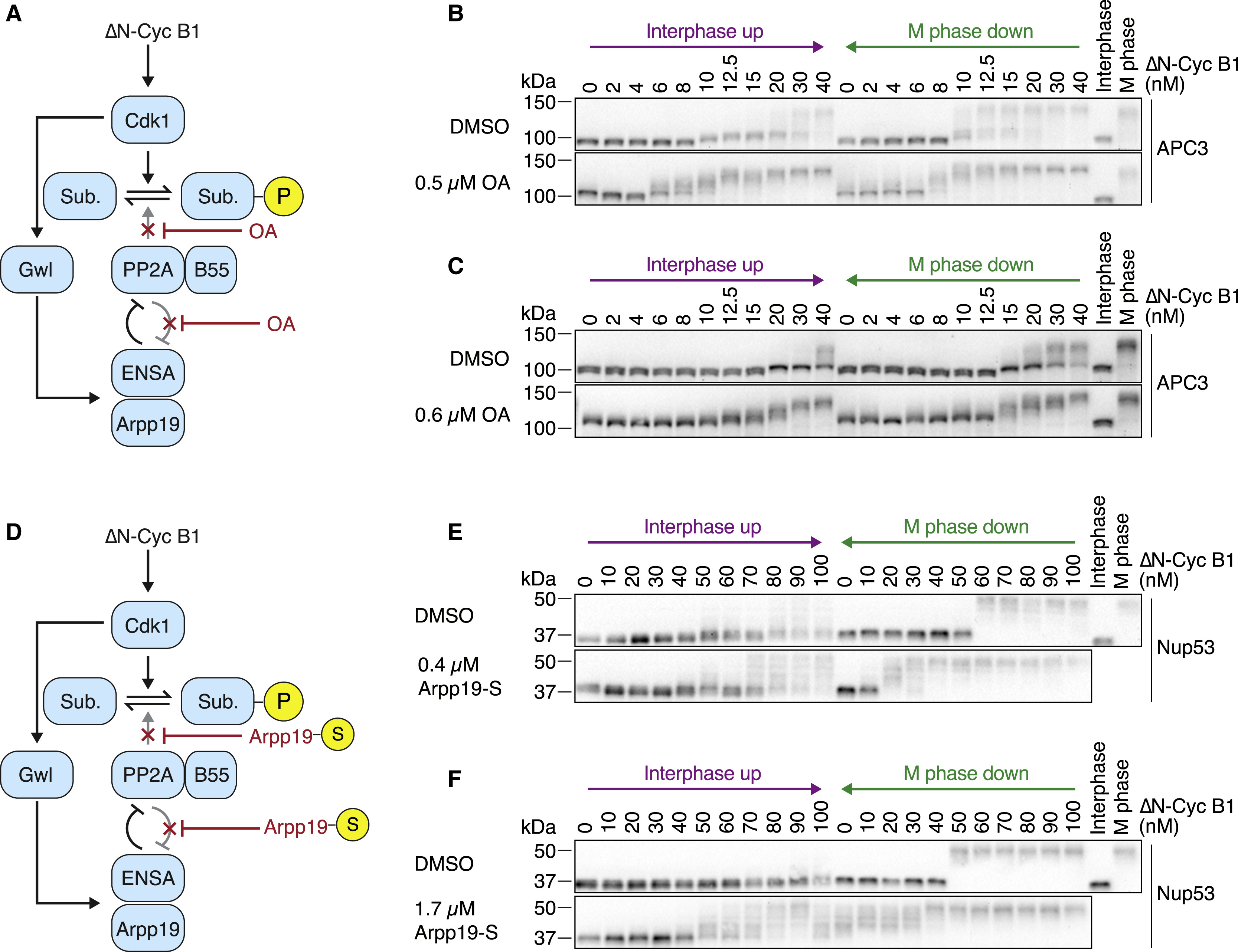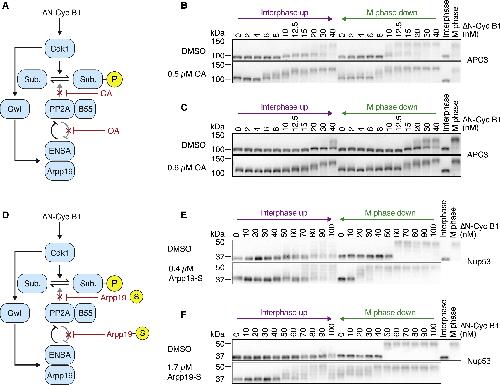 Figure 5. Dampened PP2A Activity Weakens the Bistability in Cdk1 Substrate Phosphorylation (A) Okadaic acid (OA) was used to partially inhibit the activity of PP2A-B55 and the feedback between PP2A-B55 and ENSA/Arpp19. (B and C) The dose-response relationship of the phosphorylation state of the APC/C subunit APC3 as a function of ÎN-Cyc B1, approaching steady state starting from either a state of high (M phase down) or low (interphase up) cyclin B concentration/Cdk1 activity in the presence of the Wee1/Myt1 inhibitor (25 μM PD0166285) and in the absence (DMSO) or presence (OA) of different concentrations of OA. OA decreased the hysteresis seen in the DMSO control and made intermediate phosphorylation states more apparent. Note that the DMSO and OA comparisons were performed in parallel using the same extract, but (B) and (C) were performed using different extracts; biological variability may account for the differences in the overall response between the two DMSO control experiments. (D) Thiophosphorylated Arpp19 (Arpp19-S) was used to partially inhibit the activity of PP2A-B55 and the feedback between PP2A-B55 and ENSA/Arpp19. (E and F) The dose-response relationship of the phosphorylation state of Nup53 as a function of ÎN-Cyc B1, approaching steady state starting from either a state of high (M phase down) or low (interphase up) cyclin B concentration/Cdk1 activity in the presence of the Wee1/Myt1 inhibitor (10 μM PD0166285) and in the absence (DMSO) or presence (Arpp19-S) of different concentrations of Arpp19-S. Arpp19-S decreased the hysteresis seen in the DMSO control and made intermediate phosphorylation states more apparent. Note that the DMSO and Arpp19-S comparison was performed in parallel using the same extract, but for (E) and (F) was performed using different extracts; biological variability may account for the differences in the overall response between the two DMSO control experiments, and variability in the activity of the ÎN-Cyc B1 preparation might account for overall differences in the response curve when comparing (C) and (D) to (E) and (F). See also Figure S4. |