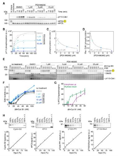 Figure S1. Characterization of the Wee1/Myt1 inhibitor PD0166285 and the antibodies used in this study, Related to Figure 1 (A) Titration of the Wee1 inhibitor PD0166285. An interphase extract supplemented with cycloheximide was treated with different concentrations of PD0166285 or DMSO. Because Wee1 only phosphorylates the Cdk1-cyclin B complex, complex formation was initiated by adding non-degradable cyclin B. To prevent the active Cdk1-cyclin B complex from inhibiting the Wee1 kinase, the Cdk1 inhibitor roscovitine (1 mM) was added to the extract. The phosphorylation of Cdk1 was followed over time using a phospho-specific antibody recognizing Cdk1 tyrosine 15 phosphorylation (pY15). APC3 functions as a loading control and as a control for low Cdk1 activity. (B) Quantification and exponential fits, full circles and lines respectively, of the experiment shown in (A), and an additional technical replicate (clear circles and dashed lines). (C) The apparent first-order phosphorylation rate of Cdk1 tyrosine 15 by Wee1 kinase (derived from the fits in (B)) as a function of the concentration of the Wee1/Myt1 inhibitor PD0166285. The fit (dashed line) yielded an IC50 of 3 μM. (D) Maximal phosphorylation signal (normalized to the DMSO control) after 120 min of incubation plotted as a function PD0166285 concentration. The fit (dashed line) yielded an IC50 of 1.4 μM. (E and F) Dose-response of Cdc25 hyperphosphorylation and Cdk1 tyrosine 15 phosphorylation (E) as well as Cdk1 activity (F) as a function of non-degradable cyclin B1 (âN-Cyc B1) for different concentrations of the Wee1 inhibitor PD0166285 during M phase entry. Inhibitor concentrations of 5 μM and higher resulted in a lower threshold for Cdc25 hyperphosphorylation, absence of any detectable Cdk1 tyrosine 15 phosphorylation (E), and a more gradual increase in Cdk1 activity (F). (G) Quantitation of the APC3 hyperphosphorylation as a function of DN-Cyc B1 concentration. Shown is the mean and the standard error of the mean from 3 independent experiments. (H) Linearity tests for the antibodies used quantitatively in this study. Proteins were detected with the respective antibodies from a dilution series of an M phase extracts as well as from a sample treated with l phosphatase; signal intensities were quantified and plotted. Solid lines show the linear fit of the data. |