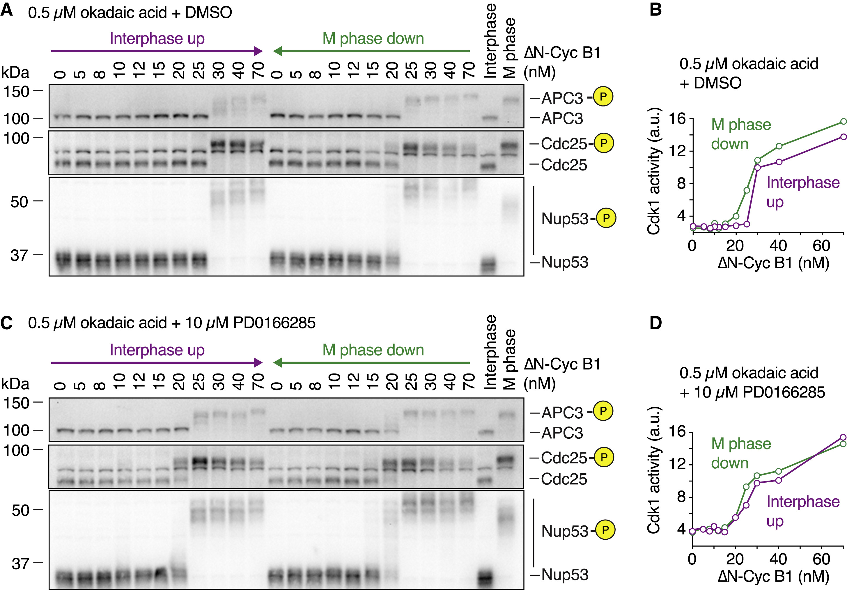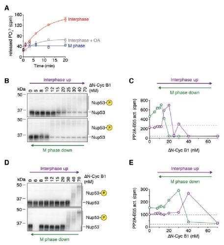 Figure S2. PP2A-B55 activity exhibits bistability, Related to Figure 4. (A) Measuring PP2A-B55 activity. The release of inorganic phosphate from a radioactively labeled PP2A-B55 substrate (MBP-Fzy S50) was followed over time using a scintillation counter. The activity of PP2A-B55 was significantly higher in an interphase extract than in an M phase extract and was inhibited by the addition of 2.5 μM okadaic acid (OA). Shown are the mean and standard deviation of a technical triplicate (circles with error bars) and fitted to either exponentials (interphase, interphase + OA) or a straight line (M phase). (B-E) Two additional independent experiments similar to the one shown in Figures 4B and 4C measuring mitotic substrate phosphorylation (monitored by the mobility shift of Nup53, (B) and (D)) and PP2A-B55 activity ((C) and (E)) as a function of non-degradable cyclin B1 (DN-cycB1) approaching steady state starting from either a state of high (M phase down, green) or low (Interphase up, purple) Cdk1 activity/cyclin B concentration (mean of a technical duplicate, circles, with connecting lines) in the presence of 10 μM PD0166285. |