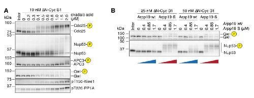 Figure S4. Characterization of the PP2A inhibitors okadaic acid and thio- phosphorylated Arpp19, Related to Figure 5 (A) Titration of the PP2A inhibitor okadaic acid. An interphase extract was supplemented with a low concentration of non-degradable cyclin B (âN-Cyc B1) and different concentrations of okadaic acid. After reaching steady-state, the phosphorylation states of several Cdk1 substrates were analyzed by mobility shift. Concentrations between 0.4 μM and 0.6 μM okadaic acid subtly impacted the phosphorylation state of several Cdk1 substrates including Cdc25, Nup53, Gwl and Wee1, but not the phosphorylation of PP1 at threonine 320 and the hyperphosphorylation of APC3. (B) Titration of the PP2A-B55 inhibitor Arpp19-S (thiophosphorylated Arpp19). An interphase extract was supplemented with low concentrations of non-degradable cyclin B (âN-Cyc B1) and different concentrations of Arpp19-S. After reaching steady-state, the phosphorylation states of several Cdk1 substrates were analyzed by mobility shift. 0.4 μM Arpp19-S but not unphosphorylated Arpp19 changed the phosphorylation state of both Gwl and Nup53. |