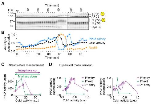 Figure S5. PP2A-B55 activity peaks prior to mitotic entry and during mitotic exit, Related to Figure 7 (A and B) An additional time course experiment similar to the one shown in Figure 7D and 7E. Mitotic substrate phosphorylation ((A), quantified for Nup53 in orange in (B)), cyclin B2 concentration (A) and Cdk1 and PP2A-B55 activity ((B), black and blue respectively) were measured every two minutes in a cycling Xenopus laevis egg extract. For PP2A-B55 the measurements, the assays were carried out on undiluted extracts; thus the PP2A-B55 activity could be changing during the 3 min if the phosphatase assay. Accordingly, we have plotted the time of each PP2A-B55 measurement as the middle of this incubation period, and show the range of the assay time as a horizontal line. (C and D) The steady-state response of PP2A-B55 as a function of Cdk1 activity compared to the relationship between PP2A-B55 activity and Cdk1 activity derived from the time course experiments (Figures 7D, 7E and S5B). The similarity between the steady-state (C) and the time resolved data (D) argues that the regulation of PP2A-B55 activity is fast and close to steady-state at any given time. The steady-state response of PP2A-B55 activity shown in (C) is the same as shown in Figure 4C, except that we have plotted activity as a function of Cdk1 activity rather than cyclin concentration. |