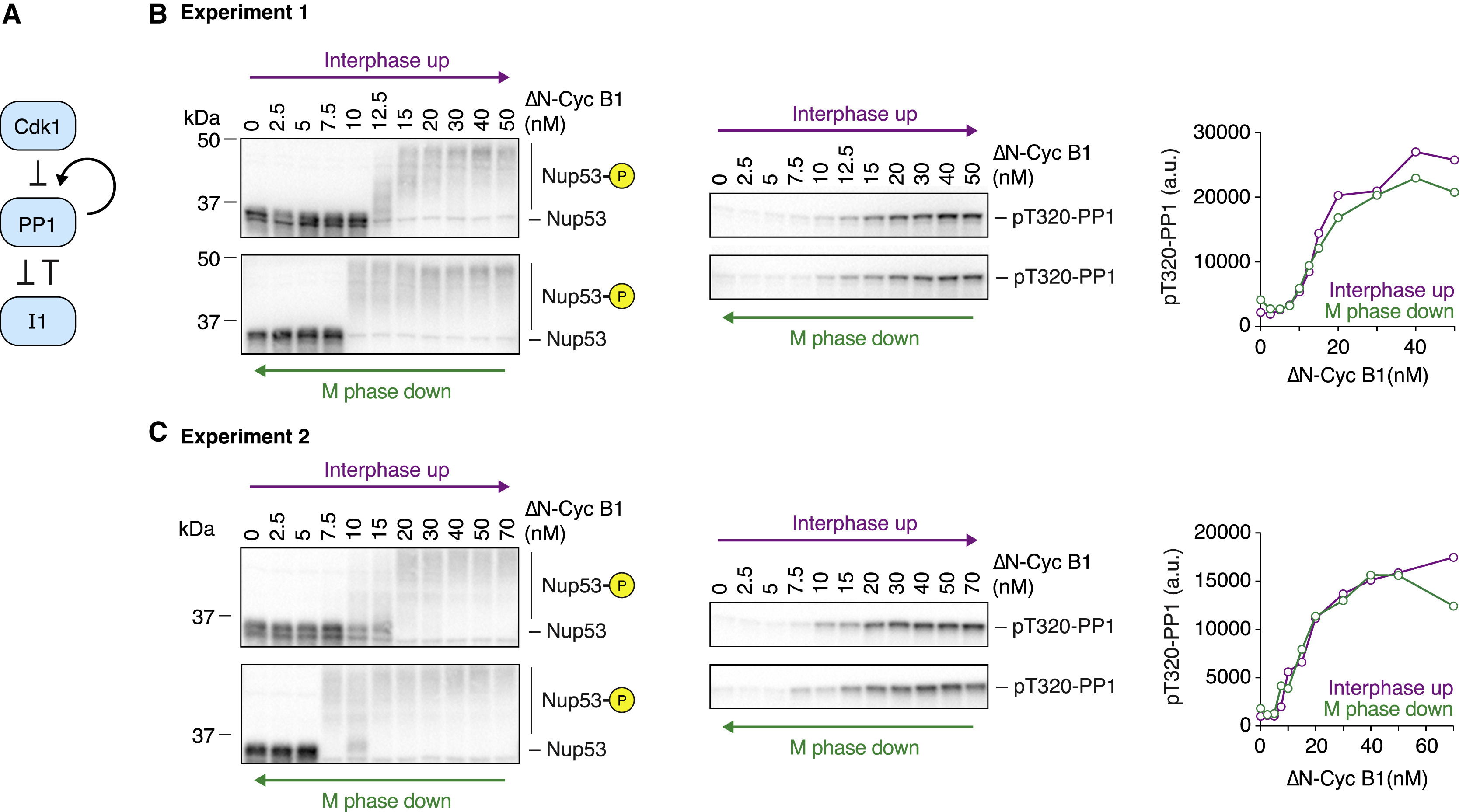 Figure 3. PP1 T320 Phosphorylation Does Not Exhibit Bistability (A) Schematic of the regulation of PP1 activity by Cdk1 and inhibitor-1 (I1). (B and C) Two independent experiments examining whether the phosphorylation of the C-terminal regulatory tail of PP1 at T320, which can be taken as a measure of PP1 activity, is hysteretic. Although Nup53 phosphorylation showed bistable behavior in both experiments, PP1 T320 phosphorylation was graded and monostable. 10 μM PD0166285 was used to inhibit Wee1/Myt1 in (B) and 5 μM in (C). |