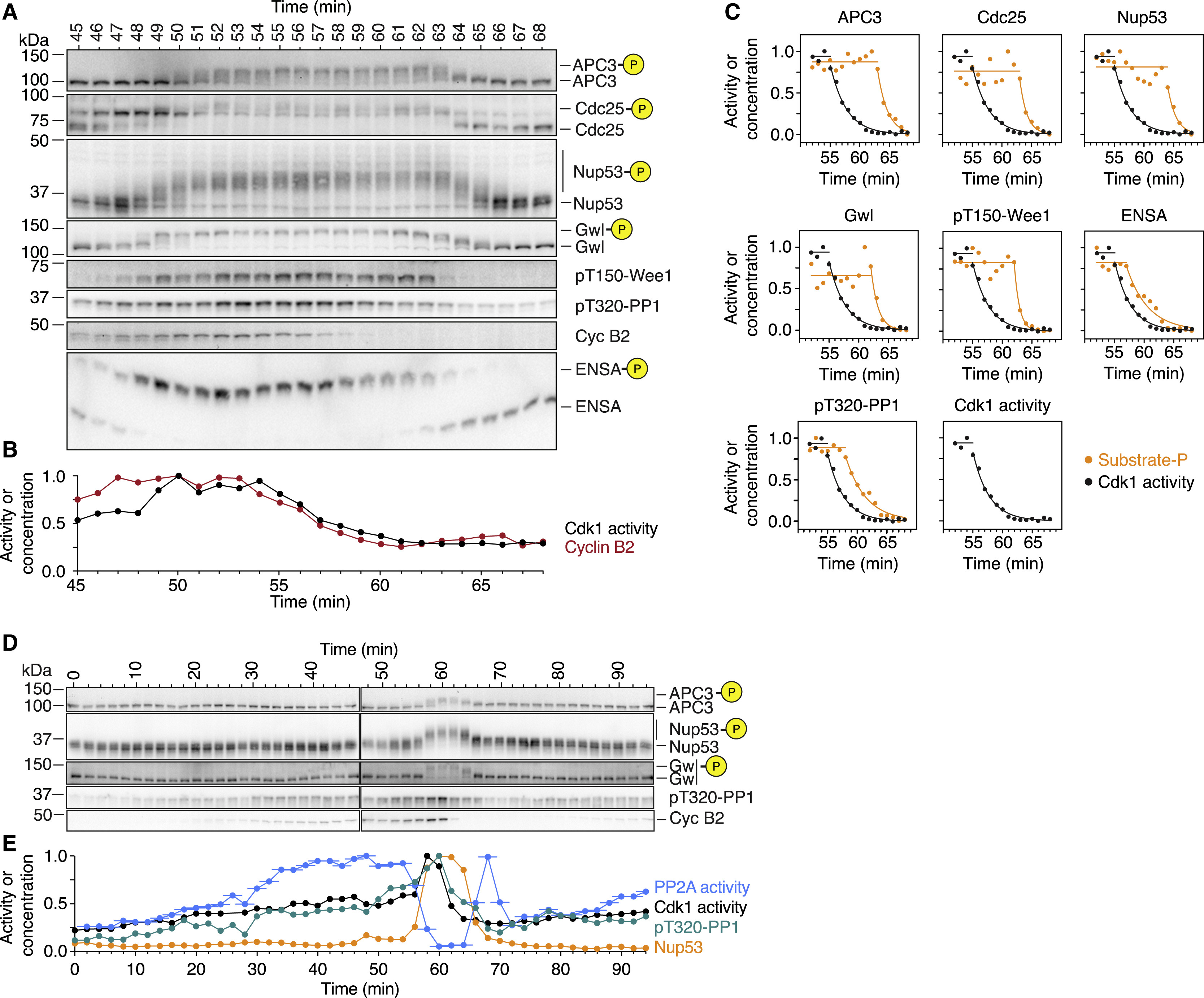 Figure 7. PP2A-B55 Activity Peaks prior to Mitotic Entry and during Mitotic Exit (AâC) Phosphorylation and dephosphorylation of Cdk1 substrates show a distinct time lag compared to the increase and decrease in cyclin B concentration and Cdk1 activity. The changes in Cdk1 activity (B and C; mean of a technical duplicate), cyclin B2 concentration (A and C), and the phosphorylation of several substrates (B) were measured with high temporal resolution in a cycling extract progressing through mitosis. Note that cyclin B2 and Cdk1 activity are minimal at 61 min whereas most substrates are still hyperphosphorylated (B and C; for Cdk1 activity and the phosphospecies [as a fraction of total signal], exponential decays were fitted to the declining part of the time course). (D and E) PP2A-B55 activity peaks prior to mitotic entry and during mitotic exit. The phosphorylation of two mitotic substrates (D; quantification for Nup53 and PP1 T320 is shown in E in orange and green, respectively) as well as the concentration of cyclin B2 (D) and the activity of Cdk1 and PP2A-B55 (E; black and blue, respectively) were measured in a cycling extract progressing through mitosis. For the PP2A-B55 measurements, the assays were carried out on undiluted extracts; thus, the PP2A-B55 activity could be changing during the 3 min the phosphatase assay is performed. Accordingly, we have plotted the time of each PP2A-B55 measurement as the middle of this incubation period and show the range of the assay time as a horizontal line. Note that in contrast to PP2A-B55 activity, PP1 T320 phosphorylation closely follows the activity of Cdk1 (D and E). An additional independent experiment is shown in Figures S5A, S5B, S6, and S7. |