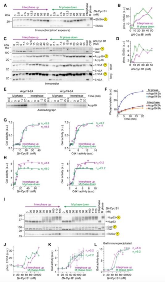 Figure S3. Gwl kinase activity exhibits ultrasensitivity but not bistability, Related to Figure 4 (A) Shorter exposure of the ENSA immunoblot shown in Figure 4D. (B) Quantification of the hyperphosphorylated form of ENSA from the experiment shown in Figure S3A. (C) An additional independent experiment analyzing the dose-response of Greatwall kinase, Arpp19 and ENSA phosphorylation as a function of âN-Cyc B1 concentration (similar to Figure 4D). An antibody raised against a conserved region of ENSA (third and fourth blot from the top) and an antibody raised against full-length Arpp19 (second blot from the top) showed similar behavior. Phos-tag (10 μM) was used to enhance the mobility shift upon ENSA and Arpp19 phosphorylation (second to fourth blot from the top). (D) Quantification of the hyperphosphorylated form of ENSA from the experiment shown in Figure S3C. (E and F) Measuring Greatwall (Gwl) kinase activity. Recombinant Arpp19-2A (S28A S109A), which maintains the Gwl phosphorylation site (S67) but carries mutations in two other prominent non-Gwl phosphorylation sites (Cdk1 for S28 and PKA for S109, respectively), or the recombinant Arpp19-3A (S28A S67A S109A), were incubated with M-phase or interphase extract and the incorporation of 32P was monitored over time by autoradiography after resolving the protein on an SDS polyacrylamide gel (E). The kinase activity toward Arpp19-2A was increased in M phase. Quantification of the signals from the autoradiograph as a function of time, plus an exponential fit of the data (lines), are shown in (F). (G and H) Two additional independent experiments measuring Gwl activity as a function of non-degradable cyclin B1 (DN-Cyc B1, left) or Cdk1 activity (right). The dose-response relationships of Greatwall kinase activity show strong ultrasensitivity but no hysteresis. Fitted Hill curves yielded apparent Hill exponents of 3 to 21. (I-L) An additional independent experiment analyzing the dose-response of Greatwall phosphorylation and activity, and Arpp19/ENSA phosphorylation, as a function of âN- Cyc B1 concentration. Arpp19/ENSA phosphorylation was detected using an antibody against the conserved phosphorylated epitope surrounding Ser 62 and Ser 67 of human Arpp19 and ENSA, respectively. A quantification of the detected phosphorylation signal is shown in (J). Gwl kinase activity was measured directly from the sampled extracts in the presence of okadaic acid (K) similar to (G) and (H), or Gwl was first immunoprecipitated from the extract and Gwl activity was subsequently measured in the absence of okadaic acid (L). Fitted Hill curves yielded apparent Hill exponents of 3 to 9. |