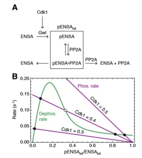 Figure S6. A possible mechanism for bistability in the PP2A-B55/ENSA circuit, Related to Figure 7 (A) Schematic depiction of the modelled Cdk1-ENSA/Arpp19-PP2A regulatory circuit. The scheme starts with the unfair competition model, where Gwl phosphorylates ENSA, pENSA binds PP2A-B55, and the complex then dephosphorylates itself and dissociates into ENSA and PP2A-B55 [S1]. In addition though we assume that free PP2A-B55 can dephosphorylate the complex in trans. (B) Rate-balance analysis of the model. This shows the rate of phosphorylation and dephosphorylation of pENSAtot at various assumed concentrations of active Cdk1. The filled circles represent stable steady states, and the open circle an unstable steady state. The parameters for the model are found in Table S1. |