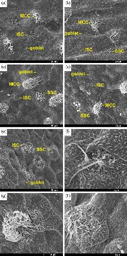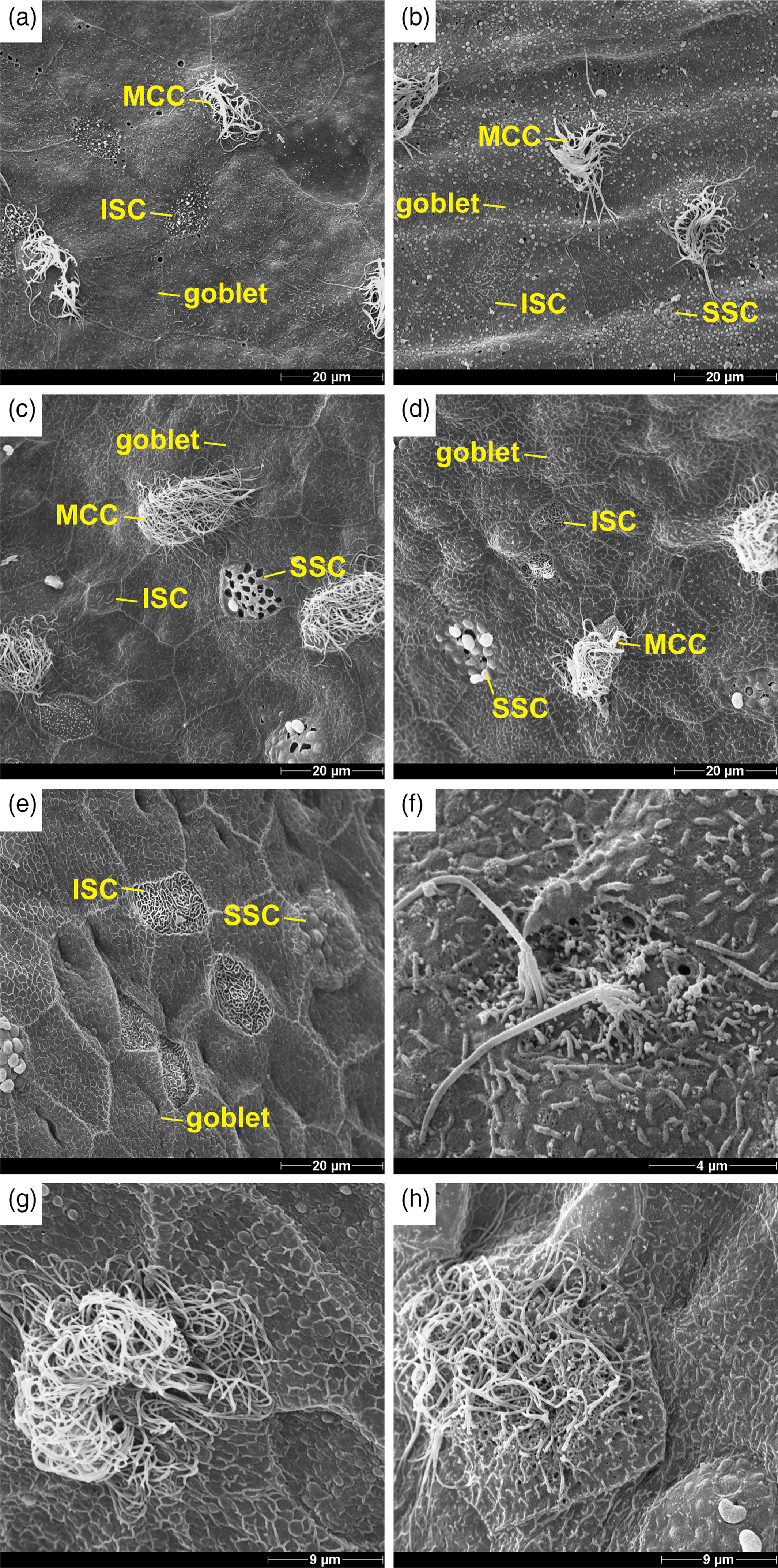 Morphology of the mucociliary epidermis and its cell types. (aâe) Scanning electron micrographs of the Xenopus epidermis during key stages of development and remodeling. Cell types are indicated. MCC, multiciliated cell; ISC, ionocyte; SSC, small secretory cell; goblet, mucus secreting gobletâlike cell. (a) Stage (st.) 25, (b) st. 30, (c) st. 40, (d) st. 41/42, and (e) st. 47/48. (f) Scanning electron micrograph of a mature Xenopus neuromast of the lateral line organ at st. 45/46. (g) MCC with shedding morphology at st. 41. (h) MCC with transâdifferentiation morphology at st. 45