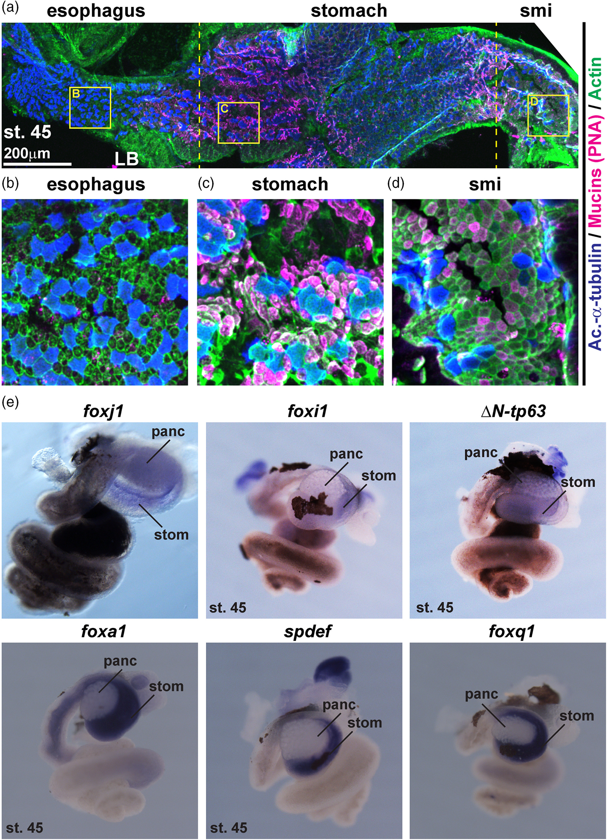 The Xenopus foregut mucociliary epithelium. (aâd) Confocal micrographs of immunostained inner epithelial lining of the Xenopus stage (st.) 45 esophagus, stomach and anterior small intestine (smi). Multiciliated cells are stained for acetylatedâαâtubulin (Ac.âαâtubulin, blue), mucus secretory cells are stained for mucins (PNA, magenta), and cell borders are stained with Phalloidin (actin, green). Magnified areas depicted in (bâd) are indicated by yellow boxes in (a). (e) Mucociliary marker gene expression revealed by in situ hybridization on isolated st. 45 guts. Panc, pancreas; stom, stomach. Image in (a) was reconstructed from multiple individual images
