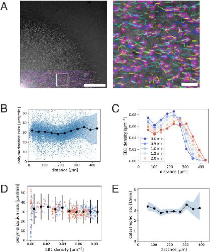 FIGURE 1:. EB1 tracking-based measurements of microtubule plus-end polymerization rate and catastrophe rate during aster growth. (A) Time-lapse movies of EB1-GFP comets are analyzed by particle tracking. Region in the white box is magnified on the right. Purple spots show the location of individual EB1 comets in this frame, while the trailing lines show the trajectory of the corresponding plus end for the preceding 10 s. The velocity of EB1 comets report microtubule polymerization rate. (B) Polymerization rate as a function radial distance from the center of the aster. N = 9348 EB1 tracks are represented as blue dots. Filled black circles and the shaded region indicate the mean and the SD of the polymerization rate for each spatial bin. The estimated mean difference in the periphery (distance > 300 µm) vs. interior (50 µm < distance < 280 µm) for t = 1.5 min was 3.7 µm/min (95% CI = [2.4, 4.9]). (C) EB1 comet density as a function radial distance. (D) Polymerization rate vs. EB1 comet density. Filled black circles and error bars indicate the mean and the SD of polymerization rate for each EB1 density bin. The different colors correspond to the same time points as in the previous panel. The estimated mean difference in the dense (0.066 1/µm2) vs. sparse (0.022 1/µm2) was 3.8 µm/min (95% CI = [2.6, 5.0]). (E) Catastrophe rate is calculated from the duration of EB1 tracks and plotted over radial distance. Filled black circles and the shaded region indicate the mean and the corresponding 95% confidence interval for the catastrophe rate for each spatial bin. Original data used for this analysis is Supplemental Movie 1. Scale bars, 100 µm and 10 µm.
