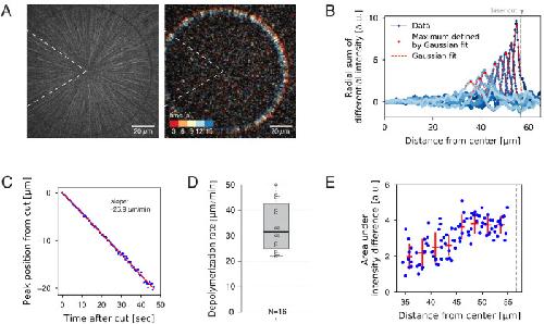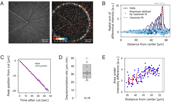 FIGURE 3:. Measurement of depolymerization rates following laser ablation. (A) An interphase aster was subjected to a circular laser cut with radius 56 µm (left), which induced a wave of microtubule depolymerization (Supplemental Movie 4). The resulting movie was used to construct a differential intensity movie (right and Supplemental Movie 5). Dotted wedge region indicates the region excluded from image analysis. (B) Radial sum of differential intensities at different time points (from dark to light blue) of the same laser cut experiment. The area under each curve equals the mass of microtubules depolymerized per time interval of 5 s. Vertical dotted line indicates the location of the laser cut. (C) For each cut, the peak position of the differential intensity travels at constant speed. (D) Depolymerization rates measured from N = 16 laser cuts positioned at 15â56 µm from the center of the aster. (E) The area under differential intensity curves decreases as the depolymerization wave travels inward. This example corresponds to the cut depicted in panels AâC. Vertical dotted line indicates the location of the laser cut.