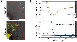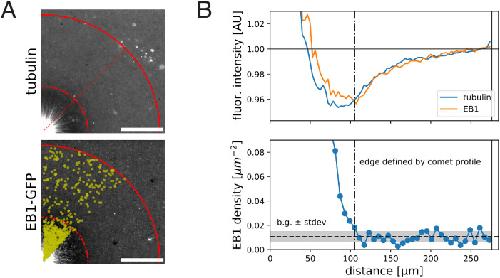 FIGURE 4:. Fluorescent intensity profiles of tubulin and EB1 indicate spatial variation of these species within growing interphase asters. (A) Wide-field images of a growing aster visualized with Alexa 647âlabeled tubulin and EB1-GFP. For both images, the contrast is adjusted to emphasize the zone of low fluorescence intensity. (B) Corresponding quantification of the fluorescence intensity profiles averaged over the quadrant and normalized to the intensity outside the aster (top) and EB1 comet density profile (bottom). We define the aster as the region that has EB1 density higher than the background level + SD. Scale bar, 100 µm.