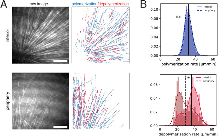 FIGURE 2:. Intensity differenceâbased measurement of polymerization and depolymerization rates in the interior and the periphery of microtubule asters. (A) TIRF microscopy movies of fluorescent tubulin were subjected to intensity difference analysis, which revealed a spatial map of polymerization and depolymerization for the interior (<100 µm away from the MTOC) and peripheral (>200 µm from the MTOC with few microtubules) region of microtubule asters. These images correspond to Supplemental Movies 2 and 3. (B) The distributions of polymerization and depolymerization rates measured from N = 6 interior movies and N = 6 peripheral movies. The polymerization rate (median 32.0 vs. 32.0 µm/min) showed no statistical difference in the interior vs. periphery (p-value = 0.819, t test). The depolymerization rate (median 37.6 vs. 26.7 µm/min) was higher in the interior (p-value = 4.44e-16, two sample Kolmogorov-Smirnov tests) with estimated difference of mean and median depolymerization rates of 7.1 µm/min (95% CI = [5.9, 8.3]) and 11.0 µm/min (95% CI = [8.4, 12.4]). Vertical lines indicate the mean for each distribution. See Supplemental Figure 1 for analysis of individual movies. Scale bar, 20 µm.