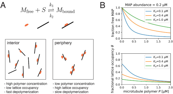 FIGURE 5:. Proposed model for the regulation of depolymerization rate by a MAP species as the limiting component. (A) We consider the equilibrium of a single MAP species that associates with the microtubule lattice with dissociation constant . We hypothesize that the degree at which a microtubule is bound by this MAP species slows down the depolymerization rate. This effect is greater in the aster periphery, where the microtubule density is lower. (B) Fraction of free MAP and occupied microtubule lattice as a function of microtubule concentration for a hypothetical MAP present at 0.2 µM.