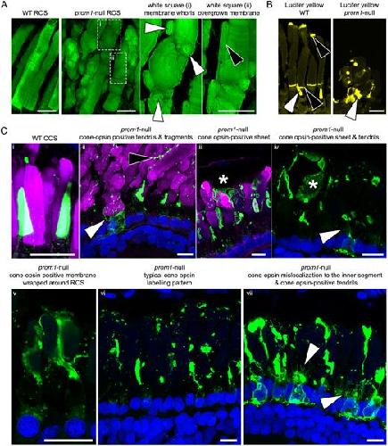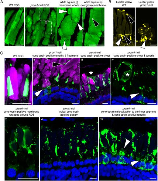 Fig. 1. Rod outer segment and cone outer segment morphology in wild-type and prom1-null X. laevis. (A) Wild-type (WT) (n=43) ROS have a cylindrical and ordered structure, whereas prom1-null (n=42) ROS are very dysmorphic. Structures of interest are stacked membrane whorls of different sizes (white arrowheads, region i) and overgrown folded OS membranes that are oriented vertically along the outside of the ROS (black arrowhead, region ii). Green, WGA. (B) Incubating retinas in Lucifer Yellow dye verified that the overgrown and dysmorphic ROS discs of prom1-null mutants were not open to the extracellular space. COS are indicated by the white arrowheads and nascent ROS discs that are open to the extracellular space are indicated by black arrowheads. It is normal for there to be open discs at both the base and the tip of the ROS. Yellow, Lucifer Yellow (n=5). (C) Wild-type COS are ordered and cone-like, with no significant inner segment localization of cone opsin besides some small puncta. In prom1-null COS, cone opsin-positive membranes were elongated and fragmented (black arrowhead). Tendrils of cone opsin-positive membrane were observed to be wrapped around the base of adjacent ROS (white arrowheads) or draped over the ROS in sheets (white asterisks). COS membranes also appeared to attach themselves to the ROS for support (v). Significant cone opsin mislocalization to the inner segment generally did not occur, but was present in a small subset of animals (vii, F0, n=6/42 samples). Green, cone opsin; blue, Hoechst; magenta, WGA. Seven replicates. The green channel (cone opsin) was adjusted non-linearly in Cii, iv and vii to show the tendrils of cone opsin-positive membrane and cone opsin inner segment localization with greater intensity. Scale bars: 10 µm.