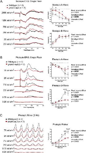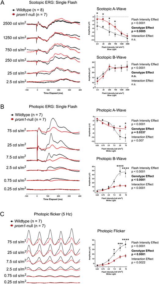 Fig. 3. Averaged scotopic single-flash recordings, photopic single-flash recordings and photopic 5 Hz flicker recordings from wild-type and prom1-null F0 animals. (A) Averaged scotopic single-flash recordings from wild-type (n=8) and prom1-null animals (n=7). (B) Averaged photopic single-flash recordings from wild-type (n=7) and prom1-null animals (n=7). (C) Averaged photopic 5 Hz flicker recordings from wild-type (n=7) and prom1-null animals (n=7). Waterfall plots (left) and transformed linear regression curves (right) were used to visualize and compare wild-type and prom1-null ERG waveforms and A- and B-wave amplitudes. Data are plotted as mean±s.e.m. From one replicate. *P<0.05, ***P<0.001, ****P<0.0001 (two-way ANOVA with Sidak's post hoc test).