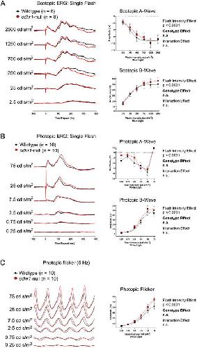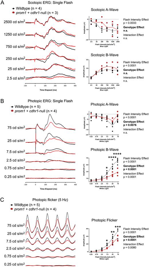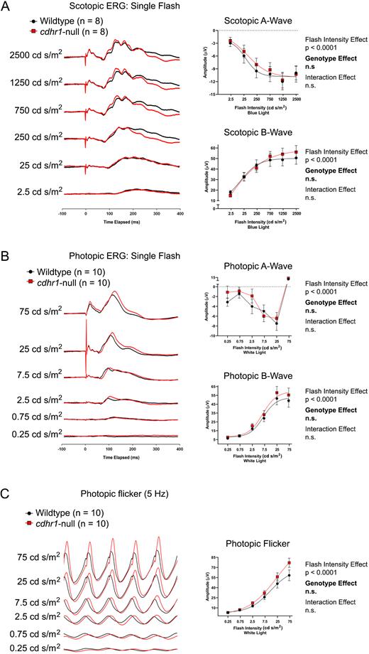 Fig. 5. Averaged scotopic single-flash recordings, photopic single-flash recordings, and photopic 5 Hz flicker recordings from wild-type and cdhr1-null F3 animals. (A) Averaged scotopic single-flash recordings from wild-type (n=8) and cdhr1-null animals (n=8). (B) Averaged photopic single-flash recordings from wild-type (n=10) and cdhr1-null animals (n=10). (C) Averaged photopic 5 Hz flicker recordings from wild-type (n=10) and cdhr1-null animals (n=10). Waterfall plots (left) and transformed linear regression curves (right) were used to visualize and compare wild-type and cdhr1-null A-wave and B-wave responses. The large positive A-wave values at 75 cd s/m2 (photopic single-flash recordings) were likely an artifact introduced by the large early receptor potential response measured by the electrode used in this experiment. Data analysis utilized a two-way ANOVA with Sidak's post hoc test. Data are plotted as mean±s.e.m. From one replicate.