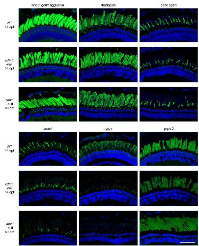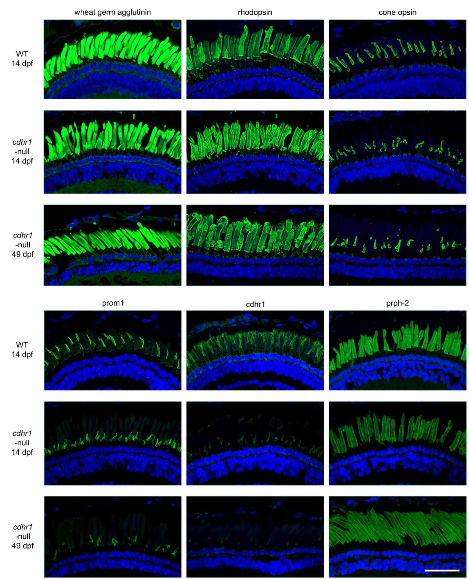 Figure S4. Immunolabelling of photoreceptor outer segment proteins in wildtype (14 dpf, top; n = 10) and F3 cdhr1-null (14 dpf, middle, n = 11; 42-43 dpf, bottom, n = 7) retinas. There was no mislocalization of any protein surveyed into the inner segment of the photoreceptors. Five replicates. Channels: green = protein of interest, blue = Hoechst. Scale bar = 50 μm. Abbreviations: dpf = days post-fertilization, prph-2 = peripherin-2, WT = wildtype.