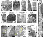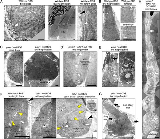 Fig. 2. TEMs demonstrating the principal changes in ultrastructure of prom1-null, cdhr1-null, and prom1 plus cdhr1 double-null mutant X. laevis compared to wild-type controls. (A) Wild-type ROS ultrastructure is highly ordered and consists of stacked OS membrane discs with properly formed hairpins (white arrowheads) that are meticulously aligned and enclosed within a plasma membrane (black arrowhead) (n=3). (B) Wild-type COS feature highly ordered stacks of disc lamellae. The leading edges of the lamellae opposite the connecting cilium are neatly aligned, whereas the hairpins near the connecting cilium are not as well aligned (n=3). (C) Prom1-null ROS sometimes lacked hairpins in the basal discs and had a severely convoluted structure where the disc membranes were overgrown and folded in on themselves. There were some instances of disc membrane invagination into the rod inner segment (dashed box) (F0, n=4). (D) Prom1 plus cdhr1 double-null ROS were indistinguishable from prom1-null ROS and featured whorls of overgrown membranes that contained disc rims (white arrowheads) (F0, n=3). (E) Prom1-null COS were difficult to observe, but commonly seen features were loops of disc membrane that appeared unattached to the cone inner segment (CIS; black arrows) and the presence of thin, loosely folded membranes above the CIS (white arrows; F0, n=3). (F) The principal feature of cdhr1-null ROS was overgrown and misaligned discs that were oriented vertically instead of horizontally within the ROS plasma membrane. Areas of overgrowth were commonly associated with large (asterisks) or small (yellow arrowheads) bubbles of membranes around the area where disc orientation changes occurred. Overgrowth of disc membrane was easily seen when the ROS was in a coronal orientation, and these areas of disc overgrowth or disorganization appeared to be contained within the plasma membrane (black arrowhead). Hairpins (white arrowheads) were still present in overgrown disc membranes (F0, n=5). (G) COS ultrastructure appeared mostly normal in cdhr1-null X. laevis, but some COS had overgrown lamellae membranes that resulted in the loss of alignment at the ciliary and non-ciliary sides of the outer segment, giving it a frayed appearance (black arrows) (F3, n=2/5 samples studies). (H) COS in prom1 plus cdhr1 double-null X. laevis were similarly difficult to visualize to prom1-null animals, and they also comprised loose, convoluted and looped thin membranes (white arrows; F0, n=3). From three replicates. Scale bars: 800 nm, except in right-hand panel for C (2 µm).