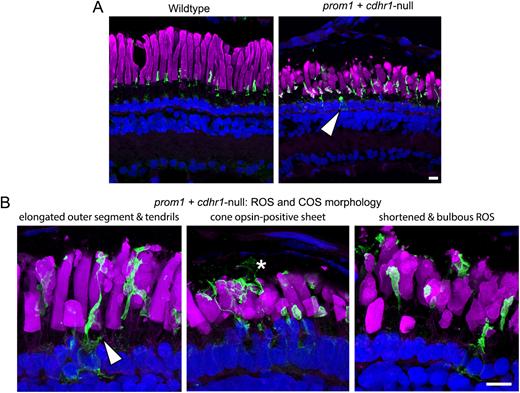 Fig. 6. Rod outer segment and cone outer segment morphology in wild-typeand F0 prom1 plus cdhr1 double-null X. laevis. Similar to prom1-null animals, ROS were shortened and bulbous and COS were elongated and fragmented. There were occasional instances of mislocalization of cone opsin to the inner segment and tendrils of cone opsin-positive membrane (white arrowheads), and sheets of cone opsin-positive membrane (asterisk) that were closely associated with the ROS (WT, n=15; F0, n=12). From three replicates. Green, cone opsin; magenta, WGA; blue, Hoechst. Scale bars: 10 µm.