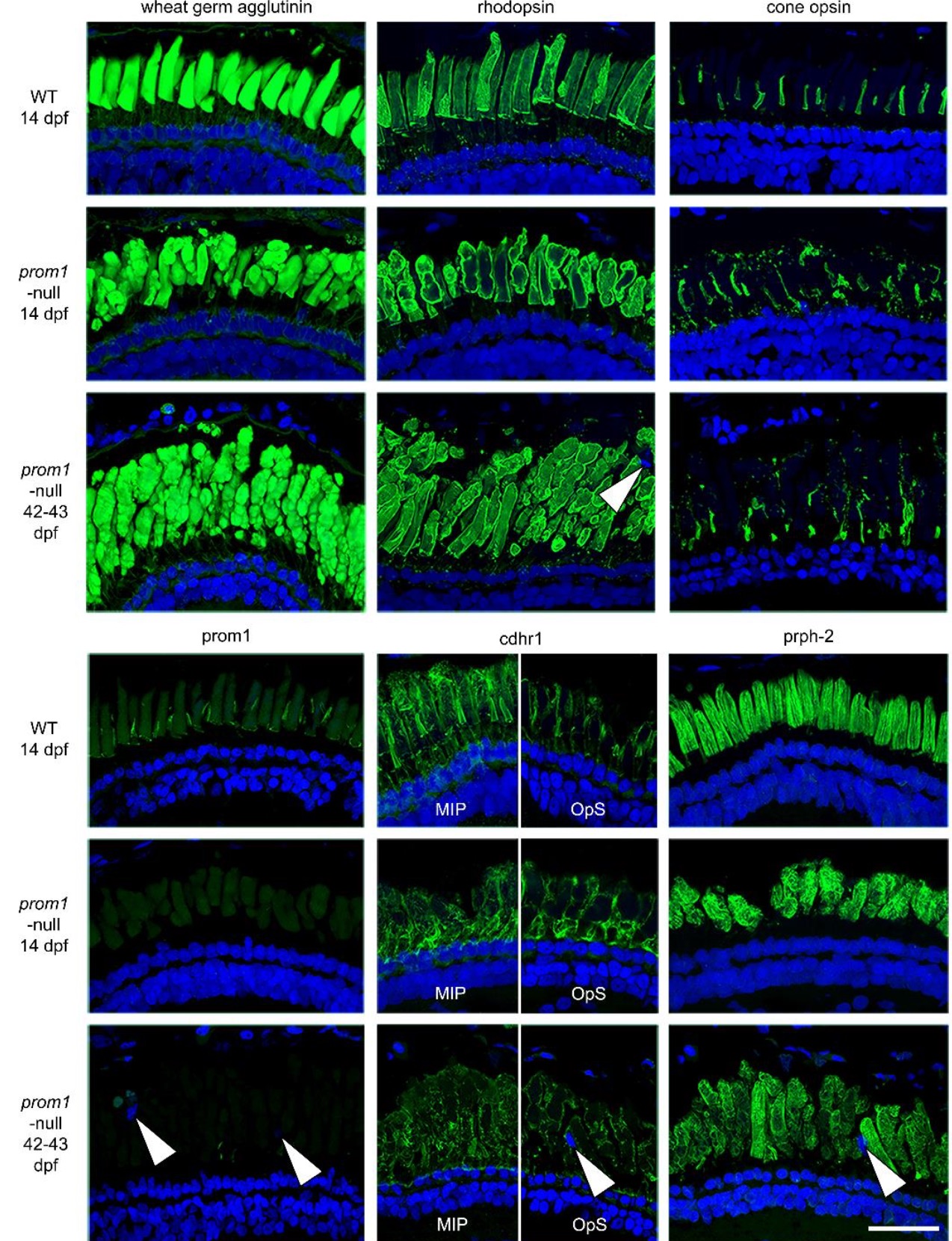 Figure S5. Immunolabelling of various photoreceptor outer segment proteins in wildtype (14 dpf, top; n = 11) and F0 prom1 + cdhr1-null (14 dpf, middle, n = 14; 42-43 dpf, bottom, n = 7) retinas. Similar to prom1-null animals, there were occasional instances of mislocalization of cone opsin to the inner segment (black arrowheads) and an increase in condensed nuclei in the outer segment layer in older animals (white arrowhead). Three replicates. Channels: green = protein of interest, blue = Hoechst. Scale bar = 50 μm. Abbreviations: dpf = days post-fertilization, prph-2 = peripherin-2, WT = wildtype.