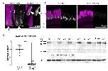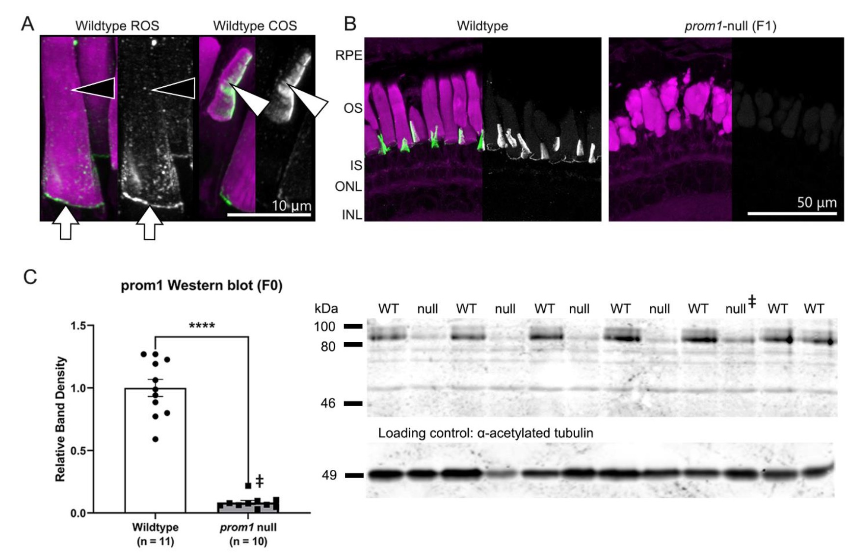 Figure S1. Immunoreactivity for prom1 protein in wildtype and prom1-null X. laevis. (A) In wildtype animals, prom1 protein was localized to the base of the ROS (white arrows), small puncta on the outside of the ROS (black arrowheads), and along one edge of the COS (white arrowheads; n = 9). (B) Prom1 immunoreactivity was lost in prom1-null retinas and the ROS/COS were dysmorphic (F1, n = 14). (C) Western blot for prom1-null F0 animals (n = 10) showed a significant reduction in prom1 protein immunoreactivity in bands of the correct molecular weight for the prom1 protein (~95 kDa) compared to wildtype animals (n = 11); p < 0.0001, unpaired student’s t-test. One animal showed successful editing by Sanger sequencing but had a smaller reduction in prom1 immunoreactivity than the others (ǂ). The upper panel shows prom1 protein and the lower panel is a duplicate blot with α-acetylated tubulin (~49 kDa) used as a loading control. Two replicates. Channels: magenta = WGA, green/white = prom1. Abbreviations: WT = wildtype.