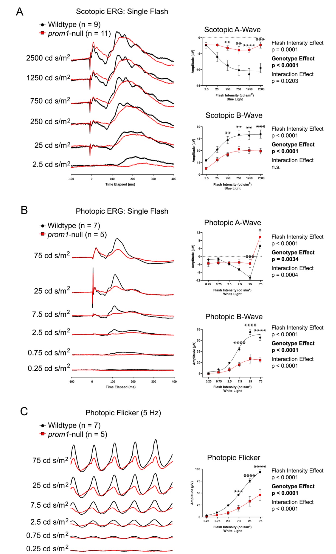 (A) Averaged scotopic single-flash recordings from wildtype (n = 9) and prom1-null F1 animals (n = 11). (B) Averaged photopic single-flash recordings from wildtype (n = 7) and prom1-null F1 animals (n = 5). (C) Averaged photopic 5 Hz flicker recordings from wildtype (n = 7) and prom1- null F1 animals (n = 5). Waterfall plots (left) and transformed linear regression curves (right) were used to visualize and compare wildtype and prom1-null F1 A-wave and B-wave responses. Data analysis utilized a Two-Way ANOVA with Sidak’s post hoc test. Data are plotted as mean ± SEM. One replicate. Statistics: p < 0.05 *, p < 0.01 **, p < 0.001 ***, p < 0.0001 ****.