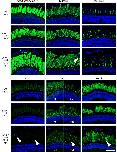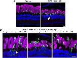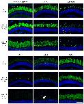 Figure S2. Immunolabelling of various photoreceptor outer segment proteins in wildtype (14 dpf, top, n = 18) and F0 prom1-null (14 dpf, middle, n = 26; 42-43 dpf, bottom, n = 26) retinas. There was no mislocalization of any protein surveyed into the inner segment of the photoreceptors, with the exception of some rare instances of mislocalization of cone opsin to the inner segment (see Fig. 1). As animals aged, there was an increase in Hoechst-stained and autofluorescent deposits in the outer segment layer (white arrowheads). Seven replicates. Channels: green = protein of interest, blue = Hoechst. Abbreviations: OpS = optical section (centre of stack). Scale bar = 50 μm.