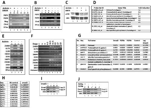 Figure 1. Ectopic expression of Activin, Smad2, and Fgfs in AC. All mRNAs (1â ng/embryo) were injected at the one-cell stage. The animal-caps were dissected at stage 8 and experiments were performed at stage 11 of Xenopus embryos. (AâC) DNAR and DNFR were injected separately and animal caps (AC) were dissected. ACs were treated with activin (25â ng/ml). The relative gene expressions were analyzed by RT-PCR and immunoprecipitation for pan Erk and pErk. (DâE) The AC were treated with activin. The specific gene expressions were analyzed by Microarray Affymetrix Xenopus Genome Gene Chip and RT-PCR of selected ESTs. (F) Stage-dependent spatial/ temporal expression of selected ESTs in whole embryos. (GâH) Fgf8a, Fgf8b and Smad2 were injected separately for RNA-Seq analysis and RT-PCR in AC.
